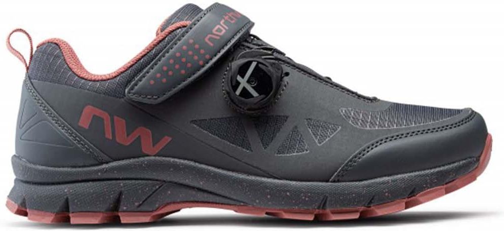 Damskie buty rowerowe Northwave Corsair znajdą zastosowanie na górskich szlakach w okresie wiosennym i letnim. Są lekkie, wytrzymałe i wiatroszczelne. Podeszwa przystosowana do bloków SPD z dwoma otworami oraz agresywny bieżnik zapewniają dobrą przyczepność podczas jazdy i po zejściu z jednośladu. Najważniejsze cechy: Podeszwa Damp Lite W konstrukcji zastosowano wytrzymałą podeszwę z naturalnej gumy. Ma średnią miękkość oraz antypoślizgowy bieżnik. Świetnie nadaje się zarówno do pedałów wpinanych, jak i platformowych. Lekka i wygodna cholewka Buty wykonano z solidnego i odpornego na przetarcia materiału. Cholewka skutecznie chroni przed wiatrem, ale zapewnia też sprawną cyrkulację powietrza i odprowadzanie wilgoci – to efekt zastosowania przewiewnej siateczki. Wytrzymałość konstrukcji podnoszą wzmocnienia PU w rejonie palców i pięty. Zapięcie z mikroregulacją Obuwie można łatwo dopasować do stopy użytkownika. Zastosowanie technologii X-Dial i pokrętła SLW 3 pozwala równomiernie rozłożyć nacisk. Zwolnienie napięcia odbywa się za pomocą przycisku. Wsparciem dla systemu wiązania jest solidny rzep w górnej części buta. Technologie: Damp Lite Lekka i wytrzymała podeszwa z bieżnikiem z naturalnej gumy. Ma optymalnie dobraną sztywność i zapewnia dobrą przyczepność obuwia zarówno do pedałów, jak i podłoża.