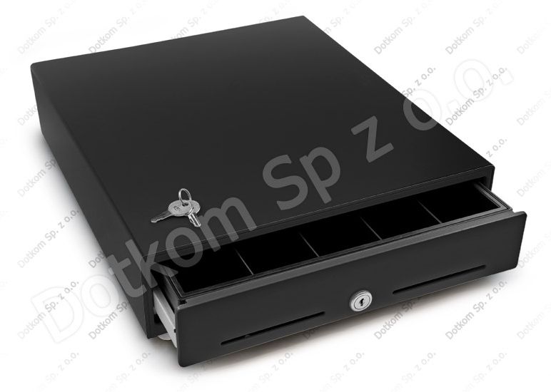 Szuflada Novitus EC-410 Szuflada ta występuje w wersjach do: Kas PS3000 (przewód zakończony wtykiem HU2) Drukarek DELIO, QUARTO (przewód zakończony wtykiem DB9 "męski") Drukarka HD E, BONO E, NEXT, Soleo Lan E, Sento LAN E (przewód zakończony wtykiem RJ6) Oporność cewki: ok. 12-13 OhmWyzwalanie napięciem: 12 - 24VWymiary: · szerokość - 410 mm ·głębokość - 417 mm ·wysokość - 100 mm (110 mm z nóżkami)(EC410, 302-086)Waga: 6,20 kgWkład: 5 przedziałów na banknoty i 8 przedziałów na monety.Wkład na monety – wyjmowany, pod spodem dodatkowe miejsce na przechowywanie banknotów, dokumentów itp.Możliwość regulacji szerokości przedziałów na banknoty. Zamek trójpozycyjny (otwarcie szuflady, otwieranie elektromagnesem, zablokowanie) z kluczem - dwa klucze w komplecie. Szczelina (podwójna) do wsuwania czeków, bonów i talonów bez otwierania szuflady. Możliwość awaryjnego otwierania (dźwignia umieszczona w od spodu szuflady).