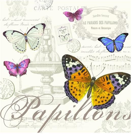 SERWETKI PAPIEROWE - Papillons - Nostalgie Motyle Wysokiej jakości serwetki papierowe włoskiej firmy Easy Life Nuova R2S, z motywem pięknych, kolorowych motyli na tle ze stylowymi napisami, fragmentem zapisu nutowego, czy szkicem fontanny. Serwetki są trójwarstwowe i zapakowane w przeźroczystą …