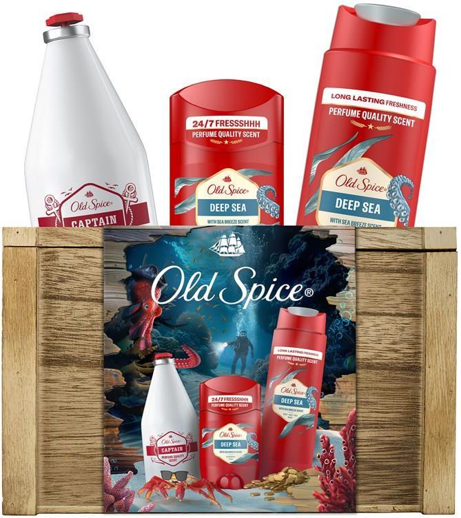 Old Spice zestaw kosmetyków dla niego Zapewnij sobie niesamowitą świeżość trwającą całą dobę, przez 7 dni w tygodniu, korzystając z zestawów podarunkowych Old Spice (efekt uzyskiwany przy użyciu żelu pod prysznic i dezodorantu). Jeśli szukasz idealnego upominku dla kogoś, kto ceni sobie przygodę i pragnie wyróżniać się legendarnym zapachem, zestaw podarunkowy Treasure Chest jest znakomitym wyborem. Zawiera: Męski dezodorant w sztyfcie Deep Sea. Żel pod prysznic Captain. Balsam po goleniu Captain. Całość jest elegancko zapakowana w charakterystyczną skrzynię skarbów Old Spice, którą można ponownie wykorzystać do przechowywania drobnych, wartościowych przedmiotów lub ukrycia "pirackich" skarbów. Zapachy Old Spice o jakości perfumeryjnej gwarantują sukces: Old Spice Deep Sea to świeża kompozycja morskiej bryzy, kwitnących kwiatów i soczystych cytrusów, przenosząca do podwodnego świata. Old Spice Captain to aromat wzburzonych fal oceanu, drzewa sandałowego i orzeźwiającej bergamotki, dzięki któremu poczujesz się jak nieustraszony kapitan świeżości.