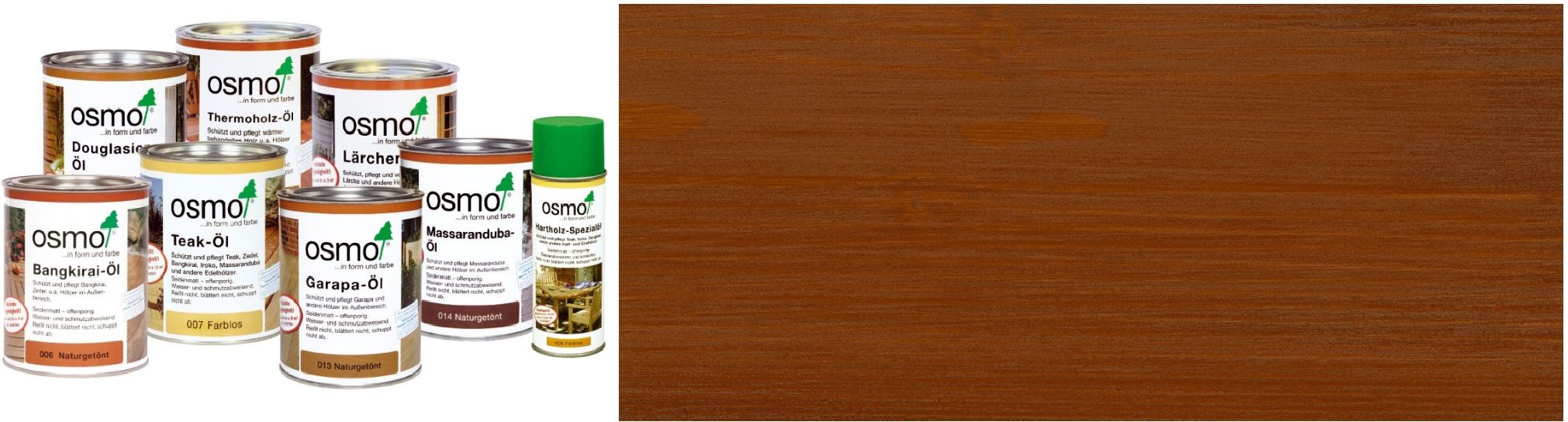 OSMO 016 Bangkirai Ciemny Olej do Tarasów, to produkt do impregnacji i barwienia drewna w zastosowaniu zewnętrznym. Olej ten posiada substancje zabezpieczające przed szkodnikami, gniciem i sinieniem drewna. Tworzy na drewnie jedwabiście matową powłokę o naturalnym odcieniu. Po aplikacji powierzchnia drewna staje się gładka, łatwa w pielęgnacji oraz hydrofobowa i odporna na brud. Narzędziami takimi jak pędzel, szczotka lub wałek Osmo z mikrowłókna, nanosimy powłokę preparatu dokładnie go rozprowadzając. Po czasie 12 godzin ( może być następny dzień )należy nanieść drugą warstwę. Uzyskana powłoka nie wymaga innych zabezpieczeń. OSMO 016 Bangkirai Ciemny to olej, który chroni, konserwuje i upiększa drewniane tarasy oraz meble ogrodowe w tym przypadku w kolorze Bangkirai Ciemny, występuje również w kolorach danglezja, cedr, koto, teak, jodła, mahoń, garapa, bezbarwnym i innych Osmo Specjalne oleje do tarasów nadają się również do obróbki innego wyposażenia ogrodu, które wymaga ochrony przed brudem i wilgocią. Konserwują one powierzchnię drewna i zapobiegają jej wysychaniu. Produkty firmy Osmo OLEJ-MODRZEW; Osmo- DAGLEZJA; Osmo OLEJ-BANGKIRAI i inne z pigmentem barwiącym, zapewniają również ochronę przed szarzeniem drewna w wyniku działania promieni UV.Zalety produktu:Użycie na zewnątrzIlość powłok: w przypadku surowego drewna dwie powłoki, w przypadku renowacji wystarcza z reguły jedna powłoka na oczyszczoną powierzchnię – bez szlifowania!Satynowo-matowy wygląd drewnaWłaściwy do drewna impregnowanego ciśnieniowoDaje każdej powierzchni gładkie wykończenie, odporny na wodę i brudWydajność 1l = ok. 24m2 przy jednej powłoceWłaściwa warstwa aplikacji: 90g/m2 przy 2 powłokachOSMO 016 Bangkirai Ciemny Olej do Tarasów, to środek nadzwyczaj trwały, wydajny i łatwy w użyciu. Osmo Olej Specjalny wnika głęboko w drewno, reguluje jego wilgotność, redukuje pęcznienie i kurczenie się drewna. Nie zatykając porów powłoka nie rozwarstwia się, nie pęka i się nie łuszczy. Celem odświeżenia wystarczy po prostu przemalować (bez szlifowania, bez pyłu szlifierskiego!). Przygotowanie powierzchni:Powierzchnia drewna musi być czysta, sucha (maksymalna zawartość wilgoci to 20 %) i pozbawiona oznak zmrożenia. Należy usunąć stare farby i lakiery (przy użyciu Osmo Zmywacz do farb nr 6000 lub poprzez wyszlifowanie drewna). Powierzchnia drewna: powinna być czysta, sucha i odpylona. Nanoszenie preparatu może odbyć się narzędziami takimi jak: pędzel, szczotka lub wałek Osmo z mikrowłokna. Należy nanieść 2 powłoki. Przed nanoszeniem olej należy dokładnie wymieszać. Specjalne Oleje do Tarasów to produkt do impregnacji i barwienia drewna w zastosowaniu zewnętrznym. Olej zawiera substancje zabezpieczające przed szkodnikami, gniciem i sinieniem drewna. Narzędziami wymienionymi wyżej nanosimy powłokę preparatu dokładnie rozprowadzając olej. Wszystkie produkty mają zastosowanie do różnych gatunków drewna. Oznacza to że przy wyborze produktu należy kierować się kolorystyką ( np. 009 Modrzew można zastosować również do tarasu Bangkirai itd). Jedynym wyjątkiem jest Olej do Tarsow 011 Iroko, który należy stosować jedynie do tego gatunku drewna.Produkt na bazie naturalnych olejów roślinnych (olej słonecznikowy i sojowy).UWAGA Pokazane zdjęcia próbek uzyskano przez naniesienie poszczególnych olejów na drewno. Warto jednak pamiętać, że na monitorze mogą wystąpić odchylenia kolorystyczne, a efekt uzyskany w rzeczywistości może różnić się w zależności od gatunku drewna, na które położono powłokę. Dlatego przed malowaniem każdorazowo zaleca się wykonanie próby. UWAGA!!!Odbiór osobisty możliwy w salonie AMAR PARKIETY ul. Krynoliny 20, 03-699 Warszawa.Prosimy o wcześniejszą informację telefoniczną lub mail, w celu przygotowania towaru do odbioru.Kontakt: 22 743 16 10, mail: sklep@amarparkiety.plJeśli z jakiegoś powodu w naszej ofercie nie znaleźli Państwo jakiegoś produktu, zachęcamy do kontaktu – jesteśmy pewni, że go dla Państwa zdobędziemy!
