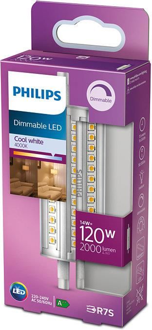 Producent: PHILIPS Towar nowy, w oryginalnym opakowaniu Gwint: R7s Moc: 14W (odpowiada 12-W tradycyjnej żarówki) Moc świetlna: 2000 lm Temperatura barwowa: 4000K (chłodna biel) Długość: 118 mm Napięcie: 220-240V Trwałość: 15 000 godzin Liczba cykli pracy: 50 000 Możliwość przyciemniania: TAK …