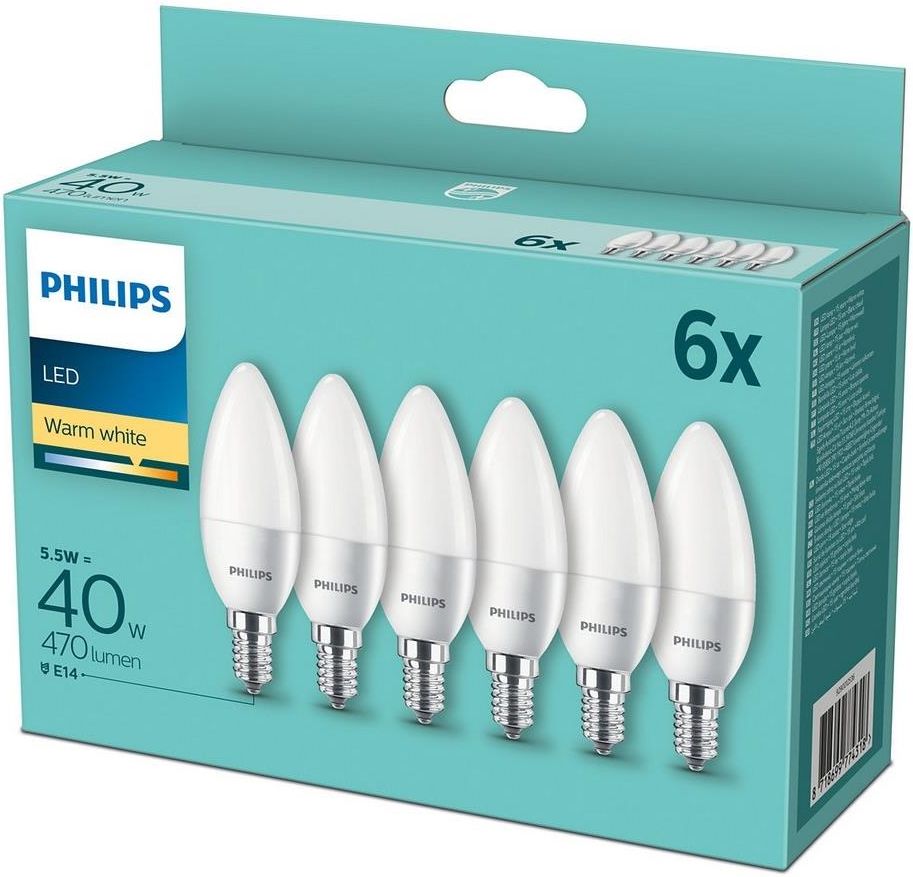 Zestaw Żarówek Led PHILIPS B35 40W E14 6szt Żarówki Philips LED zapewniają wysokiej jakości światło, wyjątkowo długi okres eksploatacji oraz natychmiastowe i znaczące oszczędności energii. Wysokiej jakości światło Poszerz swoją wiedzę o oświetleniu: Oszczędność do 90% energii Technologia LED umożliwia zaoszczędzenie nawet 90% energii w stosunku do standardowych żarówek. Zakup zwróci się w krótkim czasie i pozwoli oszczędzać pieniądze przez kolejne lata. Możesz też zadbać o środowisko naturalne. Wybierz oczywisty zamiennik tradycyjnych źródeł światła Podobne kształtem i rozmiarem do tradycyjnych żarówek Wybierz ekologiczne rozwiązanie Rozwiązanie korzystne dla portfela i środowiska Specyfikacja: Możliwość przyciemniania: Nie Barwa światła: Ciepły biały Użycie zgodne z przeznaczeniem: Wnętrza Kształt lampy: Typ świecowy bezkierunkowy Gniazdo: E14 Technologia: LED Typ szkła: Matowy Wymiary źródła światła: Wysokość: 10,3 cm, Szerokość: 3,5 cm Waga: 0,02 kg Współczynnik mocy: 0.53 Zasilanie: 220-240 V Moc: 5,5 W Odpowiednik w watach: 40 W Etykieta efektywności energetycznej: A+ Średnia trwałość (przy użytkowaniu przez 2,7 godz. dziennie): 15 a Współczynnik stabilności strumienia świetlnego: 70% Nominalny okres eksploatacji: 15 000h Liczba cykli pracy: 50 000