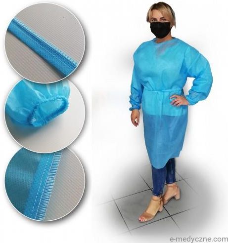 Medyczny fartuch ochronny, z włókniny Polipropylenowej ( Fizeliny Medycznej) pp40 i pp60 G, i SMS35g. Kolory: biały, niebieski, zielony. Fartuch medyczny - 40 Gramowy GRUBY - Włóknina ( Fizelina Medyczna ) Rozmiar uniwersalny. Każdy Fartuch pakowany osobno. Mogą być też pakowane zbiorczo. Przeznaczony jest dla szerokiej grupy osób, które chcą zwiększyć bezpieczeństwo i zapewnić sobie maksymalnie duży komfort użytkowania i wygody. Fartuchy szyte są na 5 nitkowych Overlockach. Dzięki temu wszystkie przeszycia i łączenia są bardzo mocne i wytrzymałe. To rozwiązanie zapewnia maksymalne bezpieczeństwo. Na mankietach wszyte są ściągacze, aby przylegały do nadgarstków. Mocowany jest na 2 wiązania w pasie i kołnierzu ( podwójnie przeszyte p przyszyte do fartucha). Nie przepuszcza płynu i wilgoci. Można dezynfekować, prasować, polewać wrzątkiem. Mocowany na 2 wiązania. Wiązania są wzmocnione. Bezzapachowy. Nie zawiera lateksu.