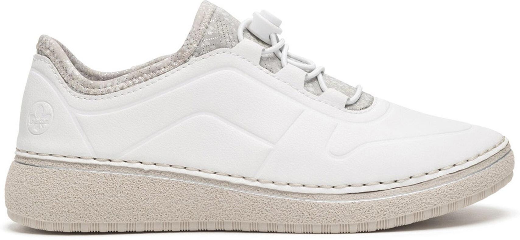 Białe sneakersy damskie marki Rieker to idealne połączenie stylu i funkcjonalności. Wykonane z włókienniczego materiału, zapewniają komfort i oddychalność przez cały dzień. Elastyczne sznurówki umożliwiają szybkie i łatwe dopasowanie butów do stóp, co zapewnia wygodę podczas noszenia. Te sneakersy to świetny wybór dla każdej kobiety, która ceni nowoczesny design i praktyczne rozwiązania w codziennym ubiorze. Idealne do sportowych i casualowych stylizacji, sprawdzą się w każdej sytuacji. Dodaj je do swojej kolekcji i ciesz się komfortem na co dzień! Od ponad stu lat marka Rieker oferuje niezwykle komfortowe i trwałe obuwie, które powstaje z myślą o zdrowiu stóp. Dzięki wieloletniemu doświadczeniu w produkcji obuwia, ta niemiecka marka doskonale potrafi łączyć wygodę ze stylem, dlatego w ofercie znajdziesz buty w modnych, oryginalnych fasonach, które każdemu przypadną do gustu. Buty Rieker tworzone są z materiałów wysokiej jakości, przez co odznaczają się wyjątkową elastycznością i trwałością, ale też lekkością. Ponadto w obuwiu stosuje się szerszą formę zapewniającą odpowiednią stabilizację stopy, specjalne podeszwy absorbujące wstrząsy oraz odciążające stawy i kręgosłup, a także wyjmowane wkładki z pianki Memory Foam, która idealnie dopasowuje się do kształtu stóp. To doskonałe produkty dla tych, którzy ponad wszystko cenią sobie komfort. Przekonaj się!