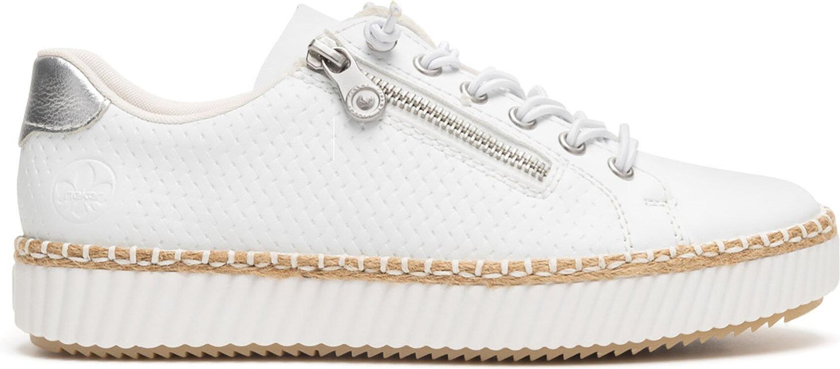 Białe sneakersy Rieker to doskonały wybór dla kobiet, ceniących zarówno styl, jak i wygodę. Wykonane z wysokogatunkowego tworzywa syntetycznego, łączą w sobie trwałość i elegancki wygląd. Zapięcie na suwak zapewnia łatwość zakładania, a elastyczne sznurówki dodają butom wyjątkowego charakteru, jednocześnie zwiększając komfort noszenia. Dzięki nim, każdy krok stanie się lekki i przyjemny. Te buty to idealna propozycja na co dzień, która z pewnością urozmaici Twoją garderobę. Wybierz jakość i design od marki Rieker! Od ponad stu lat marka Rieker oferuje niezwykle komfortowe i trwałe obuwie, które powstaje z myślą o zdrowiu stóp. Dzięki wieloletniemu doświadczeniu w produkcji obuwia, ta niemiecka marka doskonale potrafi łączyć wygodę ze stylem, dlatego w ofercie znajdziesz buty w modnych, oryginalnych fasonach, które każdemu przypadną do gustu. Buty Rieker tworzone są z materiałów wysokiej jakości, przez co odznaczają się wyjątkową elastycznością i trwałością, ale też lekkością. Ponadto w obuwiu stosuje się szerszą formę zapewniającą odpowiednią stabilizację stopy, specjalne podeszwy absorbujące wstrząsy oraz odciążające stawy i kręgosłup, a także wyjmowane wkładki z pianki Memory Foam, która idealnie dopasowuje się do kształtu stóp. To doskonałe produkty dla tych, którzy ponad wszystko cenią sobie komfort. Przekonaj się!