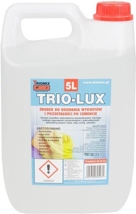 Trio-Lux to środek do usuwania rdzy, oleju, mchu, zacieków oraz wykwitów i pozostałości po cemencie. Trio-Lux znajduje bardzo szerokie zastosowanie - czyści ceramikę, gres, dachówki, klinkier oraz terakotę. Dostępny w opakowaniach: 1 l , 2 l, 5 l