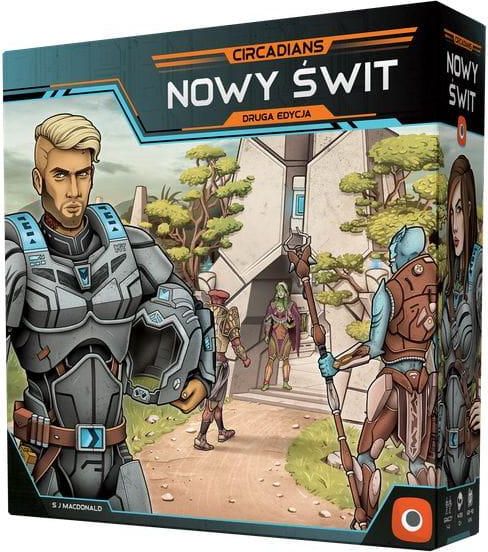 Circadians: Nowy Świt Gra euro wykorzystująca mechanikę planowania akcji i zarządzania kośćmi w futurystycznym świecie eksploracji pozaziemskiej cywilizacji, zaprojektowana przez S.J. Macdonalda (Wędrowcy znad Południowego Tygrysu oraz Architekci, Paladyni i Wicehrabiowie Zachodniego Królestwa). Circadians: Nowy Świt - o co chodzi? Oddaleni o lata świetlne od domu Circadianie, osławieni ziemscy eksploratorzy, odkryli nową planetę wypełnioną inteligentnymi formami życia. Musimy zrobić co tylko można, aby utrzymać pokój, respektując nowy świat i jego gospodarzy. Mamy rozpocząć negocjacje z 3 tutejszymi klanami, aby zyskać ich łaski i gwarancje naszego bezpieczeństwa, oraz zgromadzić próbki organiczne. To dla nas wszystkich nowy teren, ale musimy być odważni i pomysłowi. Przyszłość Circadian od tego zależy. Circadians: Nowy Świt - jak grać? W samodzielnej grze Circadians: Nowy Świt waszym celem jest poprowadzenie zespołu badaczy na niedawno odkrytej planecie Ryh. Będziecie zarządzać swoją załogą (kośćmi), aby eksplorować planetę, pozyskiwać surowce, handlować, budować ulepszenia swoich baz badawczych, konstruować wynalazki, a także negocjować z tubylcami. Tajne planowanie akcji - Na początku rundy, ukryty za zasłonką, przerzucisz swoje kości i zaplanujesz ich wykorzystanie w danej rundzie. To twój tajny plan. Kości to robotnicy - Będziesz je wystawiać w swojej bazie lub na wspólne, mocno ograniczone, pola akcji na planecie. Liczba oczek na kości decyduje o tym, gdzie możesz ich użyć oraz z jakim skutkiem. W bazie i na planecie - Twoje kości na Farmach wytworzą surowce na kolejną rundę. Te wysłane na planetę mogą sterować jej eksploracją, handlować, pozyskiwać nowych Robotników z Akademii, kupować Statki i Farmy, czy negocjować z tubylcami. : Przydatne przedmioty - Realizuj karty Kontraktów dla ich cennych trwałych umiejętności oraz możliwości punktowania na koniec gry. To ważny element budowania strategii. Asymetryczni Liderzy - Każdy gracz dysponuje Liderem, który daje jedną prostą ale silną przewagę nad resztą graczy. W połączeniu z kartami Kontraktów stworzy on unikalną kombinację budowy silniczka. Oryginalny świat - Nowy Świt wprowadza swój własny futurystyczny świat eksploracji kosmosu. Poznaj przedstawicieli odległych cywilizacji i zanurz się w odkryciach dalekiej przyszłości. Sztuczna Inteligencja - Zagraj solo przeciwko jednemu z 4 różnych przeciwników SI lub dodaj go do rozgrywki wieloosobowej. Decyzje SI oparte są na prostej talii kart, ale dobrze zastępują prawdziwego gracza. Druga edycja gry - Polska edycja zawiera drugie wydanie gry - z dodatkiem Allies, odświeżoną szatą graficzną i instrukcją, jak również powiększonym pudełkiem. Circadians: Nowy Świt - zawartość: 1 plansza Portu Kosmicznego 6 plansz Stanowisk 3 plansze Frakcji 1 plansza Negocjacji 14 kart Liderów (54x86mm) 12 znaczników Incydentu 36 kart Kontraktów (43x65mm) 20 kart Schematów (43x65mm) 16 kart Wydarzeń (43x65mm) 4 Zasłonki 4 Bazy Badawcze 1 plansza Planety 18 żetonów Statków 15 żetonów Farm 1 żeton Statku Ul Kah Tala 1 żeton Farmy Sunari 6 żetonów Skrytek z Klejnotami 3 żetony Rozwoju 1 żeton Wydarzenia Renzo 1 żeton Sala 52 Kości (po 13 na gracza) 4 Żniwiarki (po 1 na gracza) 50 Znaczników Wody 40 Znaczników Alg 30 Znaczników Energii 30 Znaczników Klejnotów 1 żeton Radia Instrukcja