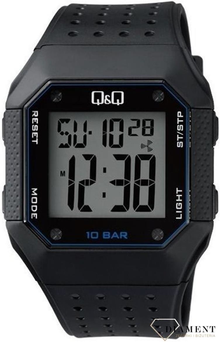 Zegarek męski Q&Q M158-003 Informacje o produkcie : Zegarek męski QQ M158-003 Rodzaj - Zegarek męski Pochodzenie - Japońskie Wskazanie czasu - Cyfrowe Pasek/Bransoleta - Pasek kauczukowy Styl - Sportowy Materiał koperty - Tworzywo sztuczne Kształt koperty - Prostokątna Kolor koperty - Czarny Mechanizm - Kwarcowy Kolor paska - Czarny Szkiełko - Hesalitowe Gwarancja - 3 lata Szerokość koperty - 40mm Grubość koperty - 13mm Wodoszczelność - Wodoszczelność 100m Kategoria : Zegarki męskie Dodatkowe atrybuty : Stoper - funkcja pozwalająca na odmierzenie czasu podczas wykonywania aktywności fizycznych oraz wielu codziennych czynności. Alarm - funkcja umieszczana najczęściej w sportowych zegarkach, której zadaniem jest przypomnienie sygnałem dźwiękowym lub wibracyjnym o wybiciu wcześniej ustawionej godziny. Często w zegarkach na rękę możemy ustawić zarówno jeden, jak i kilka alarmów Podwójny czas T1/T2 - funkcja pozwalająca na kontrolowanie czasu w dwóch strefach czasowych, co często przydatne jest podczas podróżowania. Podświetlenie - jedna z najbardziej pożądanych funkcji zegarka na rękę, pozwalająca na odczytanie danych z tarczy nawet w najciemniejszych miejscach. Podświetlenie w zegarku na rękę uruchamiane jest najczęściej poprzez przyciśnięcie dedykowanego przycisku na kopercie. Datownik - Dodatkowy element tarczy, wskazujący aktualny dzień miesiąca, tygodnia
