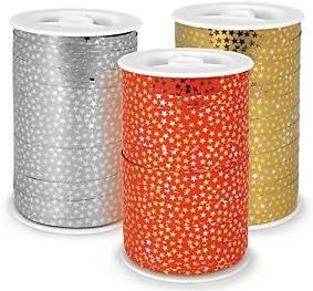 Gustowna wstążka z wzorem w gwiazdki. Dostępna w 3 kolorach: czerwonym, srebrnym i złotym. Wymiary: szer. 10 mm x dł. 100 m. Cena za rolkę.