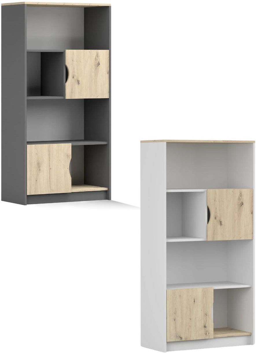 Regał wysoki Joy to idealne połączenie nowoczesnego designu z funkcjonalnością.Dostępny w dwóch atrakcyjnych wersjach kolorystycznych – biały + dąb artisan oraz szary + dąb artisan – regał doskonale sprawdzi się w pokoju młodzieżowym, dziecięcym, domowym biurze lub salonie.Wyposażony w 2 zamykane …