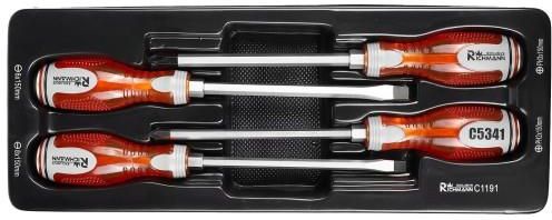 Opis produktu: Zestaw 4 sztuk wkrętaków do pobijania umieszczony we wkładzie do wózka warsztatowego typu A. Wykonane ze stali chromowo-wanadowej (CR-V) zastosowany chrom gwarantuje odporność stali na korozję, utlenianie, ścieranie i dużą wytrzymałość w wysokiej temperaturze, zaś dodatek wanadu również wpływa na odporność na działanie wysokich temperatur oraz nieuleganie deformacjom. Grot o profilu sześciokątnym do zwiększenia siły kluczami płaskimi lub oczkowymi. Budowa wkrętaków czyli umieszczenie dekielka na szczycie rękojeści pozwala na dłutowanie. Dodatkowy sześciokątny profil grotu umieszczony pod rękojeścią o większej średnicy pozwala na dokręcanie kluczem o większej średnicy a tym samym przełożeniem większej siły. Kompozytowa antypoślizgowa rączka gwarantująca komfort i ergonomię pracy. Każdy wkrętak posiada widoczny podpis na dekielku. Magnetyczne końcówki. Jakość przemysłowa.