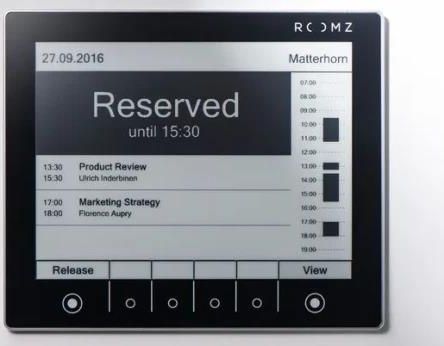 Bezprzewodowy wyświetlacz e-papier e-Ink ROOMZ 7,8 cali pokazujący plan spotkań w salach konferencyjnych. Posiada własne autonomiczne zasilanie, wymienna bateria (działa dwa lata) Bezprzewodowość - połączenie po Wi-Fi Podłączenie bez kabli (przyklejamy na specjalne plastry – np. na szybie, w budynkach zabytkowych), Zarządzanie przez chmurę producenta lub serwer klienta, Ekologia – energooszczędny, zużywa 10 x mniej energii od innych paneli