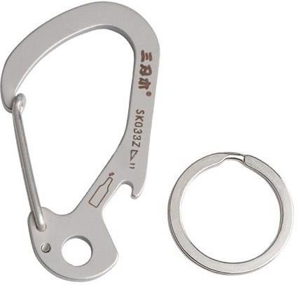 Karabińczyk Sanrenmu SK033Z (S207) Uniwersalny karabińczyk znajdujący zastosowanie w zabezpieczaniu sprzętu przed zgubieniem oraz szybkim łączeniem lin - sznura na bieliznę, mocowaniem pałatek czy podwieszaniem moskitiery. Pozwala na przypięcie np. klucza do plecaka, ekwipunku lub elementów odzieży. Dodatkowo karabińczyk wyposażono w otwieracz do kapsli oraz kółko do przypięcia kluczy. UWAGA: Karabińczyk nie jest przystosowany do zastosowania w asekuracji wspinaczkowej ani w innych zadaniach, które wiążą się z dużym obciążeniem. Dane techniczne Stal: nierdzewna Wymiary: 51 x 27,6 x 2,7 mm Waga: 10,3 g Producent: Sanrenmu, PRC