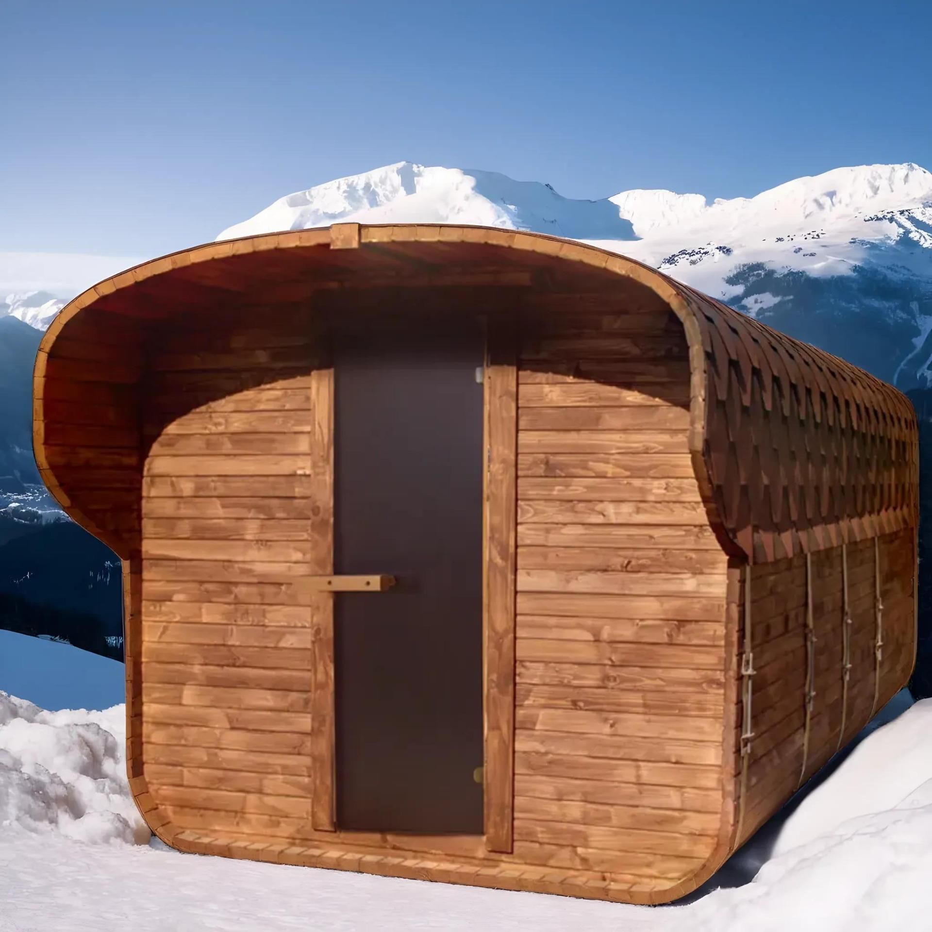 Sauna ogrodowa Quadro z Przebieralnią to kompleksowe rozwiązanie do saunowania, a kształt Quadro to maksymalne wykorzystanie przestrzeni. Zaprojektowana dla 8-10 osób do jednoczesnego saunowania, ale dodatkowa przebieralnia przed wejściem do łaźni to również miejsce i do odpoczynku. Doskonale sprawdzi się w przydomowym ogrodzie, tworząc przytulną strefę relaksu. Wyróżnia ją: Dwa izolowane powiększone pomieszczenia: Przebieralnia ze schowkami na ubrania, stolikiem i krzesłami oraz sama Łaźnia ✓ Estetyczny daszek chroniący wejście przed opadami ✓ Forma QUADRO także pozwala na montaż ławek w dwóch poziomach- im wyżej siedzimy tym cieplej ✓ Ławki także w formie litery L mając piec po lewej czy prawej, nie tylko na wprost jak w przypadku beczki ✓ Ławki mają długość od 210cm, co pozwala położyć się nawet bardzo wysokim osobom ✓ Większa ilość osób która jednocześnie może przebywać w saunie o tej samej długości w porównaniu z sauną typu beczka lub Quadro o tej samej długości z daszkiem lub tarasem Wyobraź sobie wieczór w ogrodzie, gdzie natura koi zmysły, a Ty możesz w pełni się zrelaksować. Teraz dodaj do tego własną, prywatną saunę – miejsce, które przenosi komfort i luksus na zupełnie nowy poziom. Nasza sauna ogrodowa to nie tylko przestrzeń do odprężenia, ale także inwestycja w zdrowie, dobre samopoczucie i styl życia. Kompaktowy, przemyślany design oraz zastosowanie wysokiej jakości materiałów, takich jak skandynawski świerk czy trwałe drewno liściaste, sprawiają, że ta sauna idealnie wpisuje się w każde otoczenie. Dzięki solidnej konstrukcji i impregnacji, będzie służyć przez długie lata, niezależnie od warunków atmosferycznych. Wersja: Złożona, Zestaw do samodzielnego złożenia, a może Montaż na miejscu? Złożona Sauna jest złożona w naszym zakładzie, zaimpregnowana, a wszystkie zamówione elementy już są zamontowane, więc praktycznie odrazu po postawieniu na miejscu jest gotowa do użytku. Jest to najprostszy i najszybszy metod by mieć własną saunę. Natomiast musimy pamiętać że taką saunę już nie da się ręcznie zdjąć tylko za pomocą podnośnika, a odległość pomiędzy autem z którego trzeba będzie zdjąć saunę, a miejscem postawienia, nie może być większe niż 8m i musi być wolne od przeszkód. Zestaw do samodzielnego montażu Jest to sauna która dostarczana w elementach. Wersja dla osób które lubią majsterkować, przy okazji trochę oszczędzić, a może nawet i zrobić coś wspólnie z kolegami czy rodziną. Zestaw zawiera wszystkie niezbędne elementy do złożenia sauny, więc jedynie co potrzebne to czas, wysiłek oraz instrument. Atutami takiego zestawu napewno są: cena, możliwość postawienia sauny praktycznie w każdym miejscu, bezproblemowy rozladunek ręczny i liczne pochwały bliskich. Montaż na miejscu przez naszych fachowców Trudny teren, mało miejsca czy zwyczajnie nie ma przejazdu do miejsca gdzie trzeba postawić saunę? Nasi fachowcy przyjadą, przywiozą, rozładują, złożą, zamontują wszystkie zamówione elementy oraz zaimpregnują i zabezpieczą saunę. Jedynie czego będą potrzebowali to przygotowanego terenu plus jeden metr po obrysie sauny by swobodnie się poruszać dookoła oraz dostępu do gniazdka 230v. Czas montażu uzleżniony od warunków pogodowych i wybranego modelu, ale zazwyczaj nie przekracza 2 dni. Drewno: Standard czy Termodrewno, różnice i zalety Drewno Standard Standadowo używamy do budowy Własnych Saun drewna świerkowego ze skandynawii o klasie C24, odpowiednio wysuszonego w suszarniach. Jest to najlepszy rodzaj drewna w stosunku do świerka rodzimego czy sprowadzonych z innych krajów o bardziej łagodnej pogodzie. Dzięki bardziej powolnemu wzrostowi, drewno z krajów skandynawskich jest twardzsze co wplywa na jakość i długotrwałośc produktu końcowego. Drewno Termo tzw Thermowood Ten jak i pozostałe modele sauny dostępne również w wersji wykonanej z termo drewna. Będzie to na pewno dobrym wyborem który ma szereg zalet: Odporność na Czynniki Zewnętrzne Trwałość i Stabilność Ochrona Przed Grzybami i Mikroorganizmami Ekologiczność Premialna Estetyka i Elegancja Sauny Ogrodowe z Drewnem Termo: Inwestycja w Komfort i Trwałość, ale i większy wydatek Choć sauny z drewnem Termo będą nieco droższe niż ich standardowe odpowiedniki, to wartość, jaką oferują, jest bezcenna. Wybierając nasze sauny ogrodowe, wybierasz komfort, trwałość i estetykę na lata. Inwestuj w jakość i ciesz się relaksem na najwyższym poziomie. Więcej o Termodrewnie piszemy w jednym z artykułów w naszym Kompendium Wybór Pieca Pierwsza rzecz jaką należy określić, to czy elektryczny czy na drewno. Poniżej jest tabliczka w skrócie przedstawiająca cechy każdej wersji: Elektryczny Na drewno Cena X Ekonomiczny X Autonomiczny (niezależny od dostaw energii) X Moc* X Szybciej nagrzewa się X Dłużej utrzymuje ciepło** X Bezobsługowy X Rozmiar X *Porównując piece z proponowanych modeli Harvia KIP/Cilindro/Vega oraz Harvia M3SL i Etna **Porównanie modeli Harvia KIP/Vega vs Etna12 Wybieram Elektryczny, co muszę jeszcze wiedzieć? Zalecane piece elektryczne do tej sauny to piece o mocy od 6kW, natomiast nie ma potrzeby by wybierać piec mocniejszy niż 9kW. Rzecz jasna że mocniejszy piec to szybsze nagrzewanie sauny i lepsza efektywność nawet w gorszych warunkach atmosferycznych na zewnątrz. Natomiast warto pamiętać że przyłącze na działce ma odpowiadać poborowi mocy pieca. Wybór modelu zależy tylko i wyłącznie od upodobań gdyż system działania jest podobny, a różnice są w mocy, wyglądzie oraz załadunku kamieni która przekłada się jedynie na kumulację. Lubię klasykę, wybieram piec na drewno System działania pieca na drewno tego czy innego modelu jest bardzo podobny, podstawową różnicą miedzy rodzajem pieca to załadunek od wewnątrz lub zewnątrz. 