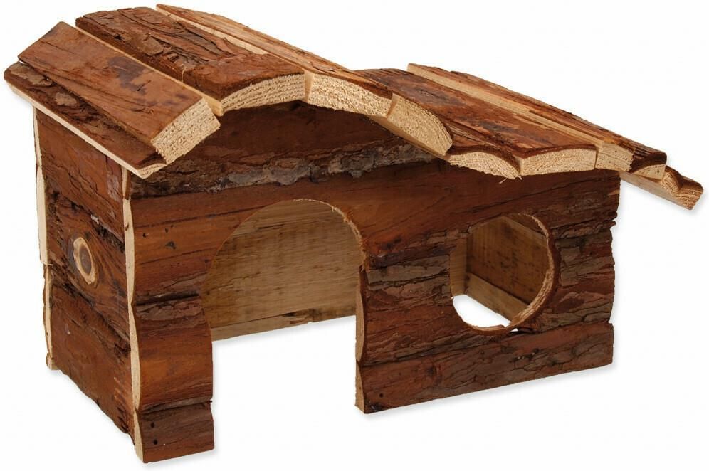 Charakterystyka drewnianego domku z falowanym dachem dla gryzoniDomek jest wykonany z nieokorowanych deseczek owocowego drzewa. Akcesorium doskonale sprawdzi się jako element wyposażenia klatki dla gryzoni. Ze względu na kształt domek najlepiej wstawić pod ścianką w jednym z rogów kuwety klatki. Pupil będzie miał wewnątrz domku znakomite schronienie, natomiast będzie mógł również wchodzić na pofalowany dach pokryty ciemną korą. Produkt w swoim składzie zawiera jedynie drewno, dlatego nie jest toksyczny. Zapewne będzie chętnie podgryzany, co pomoże zwierzakowi w ścieraniu stale rosnących u gryzoni zębów. Wymiary domku szerokość: 26,5cm głębokość: 16cm wysokość: 13,5cm Uwaga! Jeśli zabawka zostanie przez zwierzę uszkodzona, należy wyjąć ją z klatki, aby uniknąć połknięcia małych kawałków. Produkt wyłącznie dla zwierząt domowych, nie należy go używać do innych celów. Zabawka nie jest przeznaczona dla dzieci. Należy trzymać ją z dala od ognia.