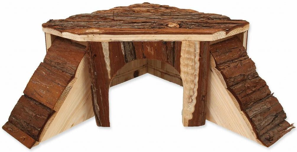 Charakterystyka narożnego drewnianego domku dla gryzoniDomek jest wykonany z nieokorowanych deseczek owocowego drzewa. Akcesorium doskonale sprawdzi się jako element wyposażenia klatki dla gryzoni. Ze względu na kształt domek najlepiej wstawić w jednym z rogów klatki. Pupil będzie miał wewnątrz znakomite schronienie, natomiast dwa podesty dadzą możliwość zwierzakowi łatwego wejścia na duży płaski dach, który powiększa powierzchnię użytkową klatki. Produkt w swoim składzie zawiera jedynie drewno, dlatego nie jest toksyczny. Zapewne będzie chętnie podgryzany, co pomoże zwierzakowi w ścieraniu stale rosnących u gryzoni zębów. Wymiary domku szerokość: 25cm długość: 25cm wysokość: 15cm Uwaga! Jeśli zabawka zostanie przez zwierzę uszkodzona, należy wyjąć ją z klatki, aby uniknąć połknięcia małych kawałków. Produkt wyłącznie dla zwierząt domowych, nie należy go używać do innych celów. Zabawka nie jest przeznaczona dla dzieci. Należy trzymać ją z dala od ognia.