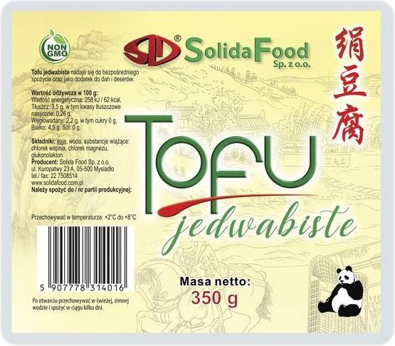Tofu Jedwabiste 350 g Solida Food ❄️ UWAGA!Produkt ten wymaga przechowywania w warunkach chłodniczych. Możemy go wysłać, ale trzeba być świadomym, że wysyłka odbywa się na własną odpowiedzialność zamawiającego. Zalecamy, aby dokonywać zakupów produktów chłodniczych z rozwagą, szczególnie w ciepłe dni. Istnieje ryzyko, iż produkt nie dotrze w optymalnym stanie. Produkty chłodnicze są wysyłane wyłącznie od poniedziałku do czwartku, aby uniknąć sytuacji, w której przesyłka leży przez weekend w magazynie kurierskim. Składniki:woda, SOJA, substancje wiążące: chlorek wapnia, chlorek magnezu, glukonolakton.Opis:Tofu jedwabiste nadaje się do bezpośredniego spożycia oraz jako dodatek do dań i deserów.WARTOŚĆ ODŻYWCZA w 100 gWartość energetyczna: 258 kJ/62 kcalTłuszcz: 3,5 g- w tym kwasy tłuszczowe nasycone: 0,3 gWęglowodany: 2,2 g- w tym cukry: 0 gBiałko: 4,5 gSól: 0 gZalecane warunki przechowywania:Przechowywać w temperaturze od +2 do +8