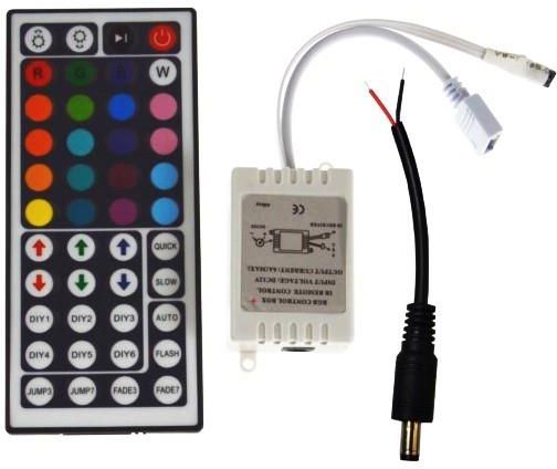 Kontroler to niezbędny element realizacji oświetlenia w systemie RGB. To dzięki niemu można wydobyć z taśmy lub żarówki LED RGB pożądany kolor oświetlenia lub wybrać jedną z funkcji dynamicznej zmiany kolorów, lub zaprogramować własne. Przeznaczony jest do pracy z dowolnym źródłem oświetlenia RGB zasilanym napięciem stałym 12V (dokładne parametry napięciowe podane w specyfikacji poniżej). Szczególnie polecany jako element sterujący do taśm RGB. Dołączony do sterownika pilot pozwala na wybór jednej z wielu opcji świecenia taśmy RGB. Funkcje dynamicznej zmiany kolorów pozwolą osiągnąć wspaniałe efekty świetlne za dotknięciem jednego przycisku. Specyfikacja: Napięcie: 12V DC Max. natężenie prądu: 6A Max. moc: 72W Wymiary centralki: 62×35×21 Wymiary pilot: 124×56×7 Długość kabelka: 130 (kabel) Zasięg pilota: 8m Zasilanie pilota: bateria CR 2025 w zestawie Zakres temperatur pracy: -20 ~ +60° Ilość przycisków na pilocie: 24 Klasa odporności: IP20 Komunikacja pilota ze sterownikiem: IR (podczerwień) Zastosowanie: Taśmy LED RGB Funkcje: - Ustawienie dowolnego koloru świecenia - Regulacja jasności świecenia - regulując jasność barwy od intensywnego koloru do czysto białego możemy uzyskać każdy odcień bieli od mocno ciepłej do zimnej bieli, a także biały z odcieniem np. fioletu lub zieleni - Pilot bezprzewodowy - działa na podczerwień - Możliwość włączenia jednego z 6 trybów automatycznej zmiany kolorów: FLASH: Tryb błyskającej zmiany kolorów AUTO: Automatyczne włączenie kolejnych trybów FADE7: Tryb płynnej zmiany w zakresie 7 kolorów FADE3: Tryb płynnej zmiany w zakresie 3 kolorów JUMP7: Tryb skokowej zmiany w zakresie 7 kolorów JUMP3: Tryb skokowej zmiany w zakresie 3 kolorów - Możliwość zaprogramowania do 6 stworzonych przez siebie kolorów, które będą wywoływane za pomocą jednego przycisku pilota (przyciski DIY na pilocie) - Kontroler posiada funkcję „Power Off memory” – oznacza to, że sterownik zachowuje ustawienia w przypadku zaniku i ponownego pojawienia się zasilania