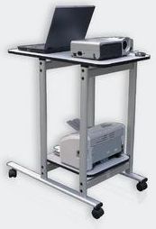 Profesjonalny, wielofunkcyjny stolik projekcyjny, posiadający dwie półki z przeznaczeniem na projektor, rzutnik, notebooka, czy drukarkę. Blat wykonano z płyty meblowej w kolorze popielatym. Aluminiowa podstawa jezdna w kolorze srebrnym, wyposażona dodatkowo w kółka z systemem blokującym, zapewniając mobilność stolika. Zalety Solidna konstrukcja Stelaż aluminiowy Wyposażony w kółka, co pozwoli na swobodne przemieszczanie produktu Dane techniczne Wymiary półek: górna 80 × 46 cm, dolna 40 x 40 cm. Wysokość: 81,5 cm Obciążenie maksymalne: góra 25 kg, dół 10 kg. Waga stolika [kg]: 11,1 Gwarancja: 2 lata.