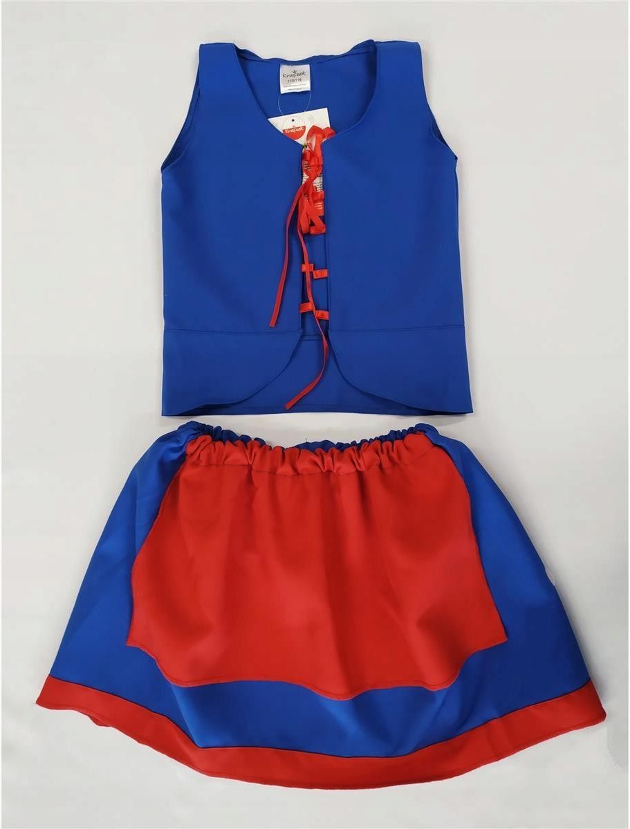Strój DZIECKO ludowy KOSTIUM KUJAWIANKA 122/128 Strój dla dzieci "Kujawianka", niebieski, Kraszek, 122-128 cm Niestandardowy i mało spotykany strój ludowy. Kostium wzorowany na tradycyjnym kujawskim, regionalnym stroju idealnie sprawdzi się na szkolnym przedstawieniu, teatrzyku lub balu przebierańców. Strój składa się ze spódniczki oraz kamizelki. Kamizelka z przodu przewiązana czerwoną wstążką, która idealnie komponuje się z czerwoną lamówką u spódnicy oraz czerwonym fartuszkiem. marka: KRASZEK, kolor: czerwony, niebieski, postać: kujawiak/kujawianka, płeć: damski, rozmiar: 122, 128, wiek dziecka: 7 lat, 8 lat, kod produktu: KUJAWIANKA-II, Komplet składa się z kamizelki i spódniczki Wymiary kamizelki: obwód kl. piersiowej ~ 60 cm długość mierzona od ramienia ~ 38 cm długość mierzona od pachy ~ 25 cm Wymiary spódniczki z fartuszkiem; ~ obwód w pasie 24-40 cm ~ długość spódniczki 38 cm ~ długość fartuszka 26 cm ...