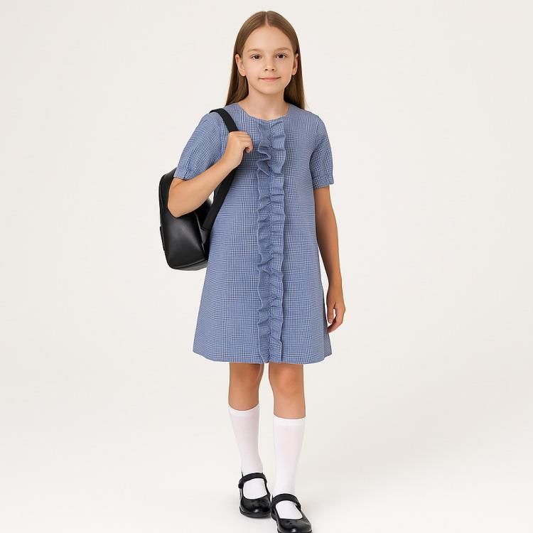Sukienka dziewczęca galowa w drobną pepitkę – rozmiar 152 Elegancka sukienka idealna na rozpoczęcie roku szkolnego oraz inne uroczyste okazje. Uszyta z tkaniny w drobną pepitkę, nadającą całości klasycznego i stylowego charakteru. Z przodu ozdobiona efektowną falbanką biegnącą wzdłuż całej długości sukienki, która dodaje jej lekkości i dziewczęcego uroku. Z tyłu wygodny, kryty suwak ułatwiający zakładanie. Krótkie rękawki z delikatnym marszczeniem podkreślają elegancki fason. Cechy produktu: Polka marka: Minimi Rozmiar: 152 (11-12 lat) Kolor: drobna pepitka (odcienie niebieskiego) Falbanka z przodu na całej długości Kryty suwak z tyłu Krótki rękaw z lekkim marszczeniem Idealna na uroczystości szkolne, rodzinne i galowe