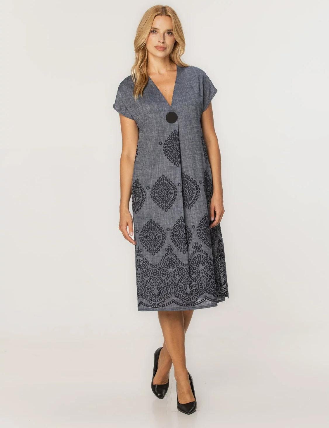 Sukienka z krótkim rękawem Letnia sukienka z krótkim rękawem, wyciętym dekoltem i dużymi kieszeniami. Dzięki lekkiemu materiałowi i braku wszytej podszewki, spódnica świetnie sprawdzi się nie tylko w casualowej stylizacji urlopowej, ale również biurowej. Kolor główny: granatowa w czarne, geometryczne wzory Rodzaj sukienki: prosty krój, długość MIDI Wykończenia: wycięty dekolt, krótki rękaw, ukryte kieszenie Skład tkaniny: 100% bawełna Gwarancja: 24 m-ce Jakość: pierwsza Producent: Willsoor