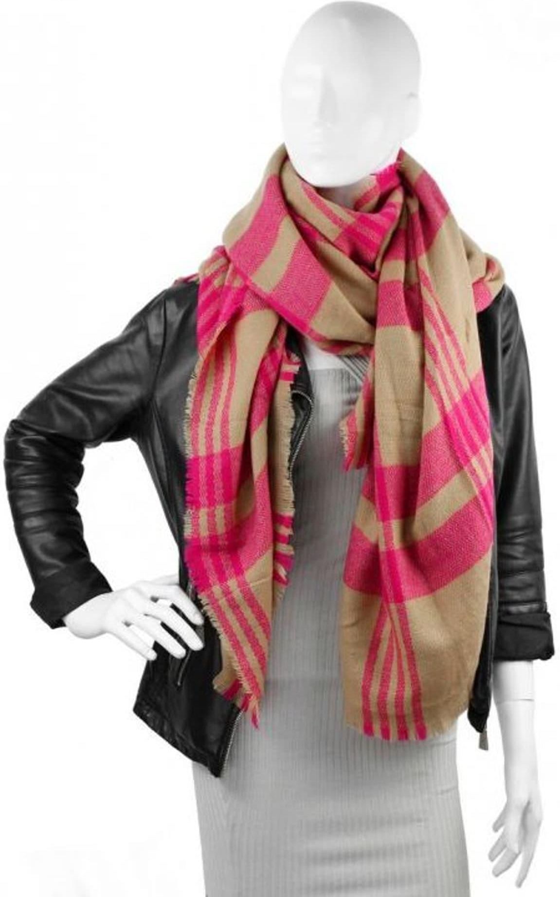 Elegancki szal / chusta w kolorach beżu i różu Wymiary : 190 cm x 85 cm Materiał : 80 % wiskoza 20 % bawełna Idealny do jesiennych kurtek oraz zimowych płaszczy.