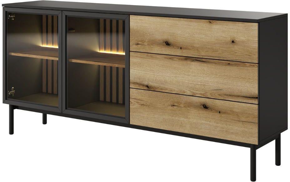 Duża komoda z kolekcji Lang o szerokości 180 cm to praktyczny i stylowy mebel do nowoczesnego salonu.Zastosowanie naturalnego dekoru dąb evoke oraz kontrastującej czerni dodaje wnętrzu wyrazistego, eleganckiego charakteru.Komoda wyposażona jest w trzy pojemne szuflady z systemem pełnego wysuwu oraz …