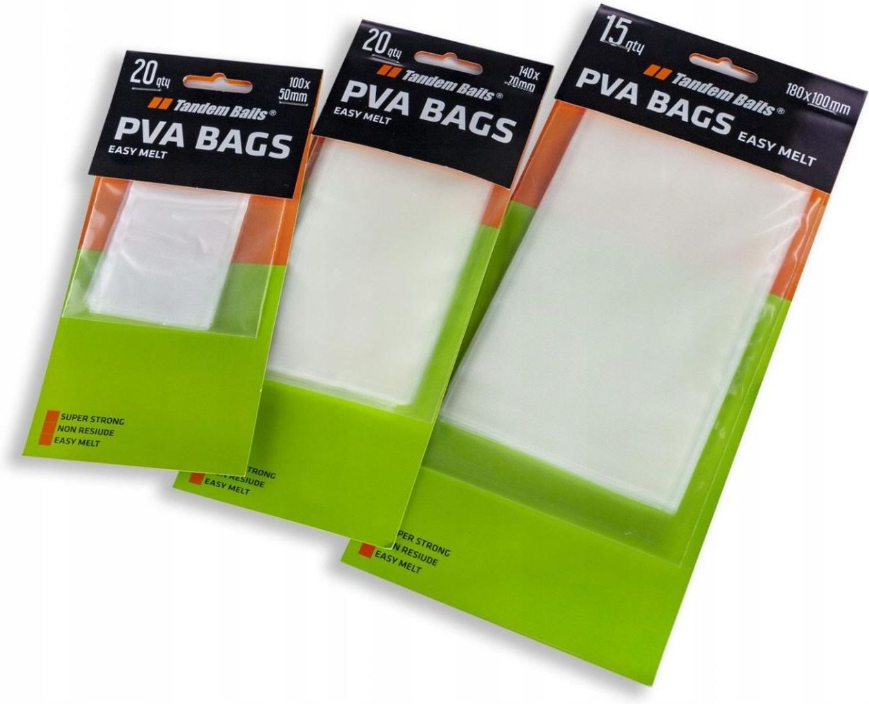 Tandem Baits PVA Worki Pocisk SR 140x55mm 20szt Worki PVA proste w użyciu i idealne na każdą karpiową zasiadkę! Doskonale nadają się do punktowego nęcenia. Oferowana wersja jest szybkoropuszczlana, więc idealnie nada się do użycia w chłodniejszych porach roku, płytszych miejscach lub kiedy chcemy, aby worek szybko się rozpuścił. Worki można napełniać pelletem, pokruszonymi kulkami, ziarnami, zanętą itp. Bez obaw można również zalewać je płynnymi boosterami, które stanowią dodatkowy wabik, ściągający w łowisko karpie. Zwykłe worki napełniamy zanętą w około dwóch/trzecich objętości, tak aby zostawić wolną część worka na zawiązanie nicią lub taśmą rozpuszczalną. Możliwe jest też użycie worka bez wiązania, a jedynie kilkukrotne nadzianie go na haczyk. Worki 100*40mm – idealne do podania tylko płynnego atraktora lub punktowo małej porcji zanęty Worki 140*55mm – do punktowego podania, efekt wabienia można zwiększyć dodając płynnych atraktorów Tandem Baits TB03934