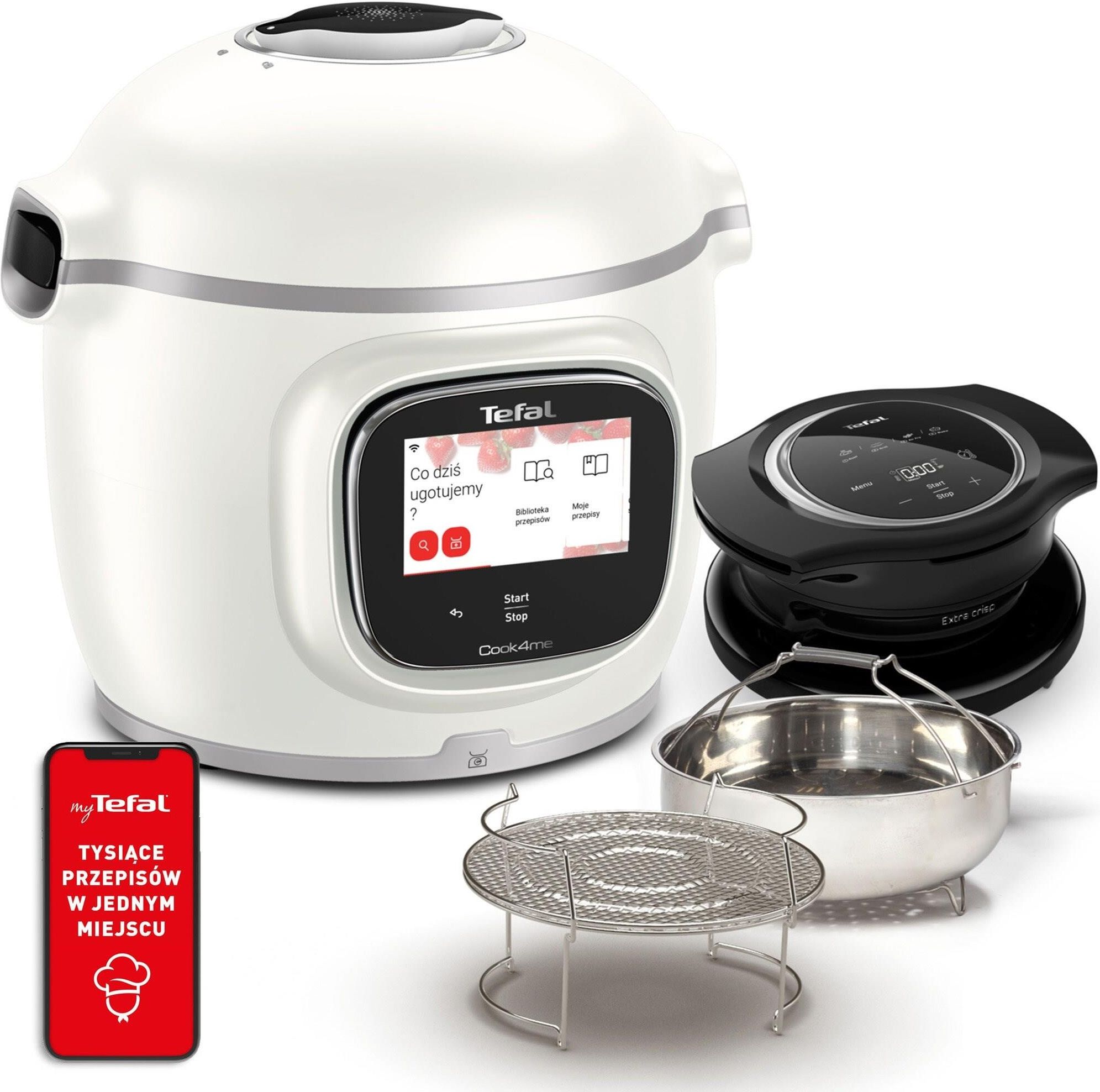 TEFAL Cook4me Touch Pro CY94X1F1OUCH  COOK4ME TOUCH Gotuj szybciej. Jedz zdrowiej. Żyj wygodniej. Jedno urządzenie wiele możliwości Cook4me łączy funkcje parowaru, szybkowaru, garnka, patelni, piekarnika, grilla, opiekacza, a nawet air fryera. Zamień Cook4me w Air Fryer Nałóż pokrywę Extra Crispy Lid, na Cook4me i gotowe. Smaż, opiekaj, grilluj i piecz! Gotuj do 6x szybciej. Zdrowy obiad w 10 minut! Bigos już w 30 minut, rosół w 35 minut - gotuj pod ciśnieniem. Aż 100 przepisów na zdrowe dania w 10 minut! Interaktywny ekran i aplikacja Intuicyjna obsługa ekranem dotykowym lub smartfonem. WSZECHSTRONNE URZĄDZENIE. AIR FRYER, SZYBKOWAR, PIEKARNIK, GRILL, GARNEK, PATELNIA, OPIEKACZ I PAROWAR Tefal Cook4me Touch Pro łączy w sobie funkcje parowaru, szybkowaru, tradycyjnego garnka, patelni, piekarnika, grilla, opiekacza, a nawet air fryera. Nie potrzebujesz już wielu różnych urządzeń! Dzięki 13 automatycznym programom możesz gotować pod ciśnieniem, na parze, na wolnym ogniu, dusić, smażyć i piec. Na dłuższe przyjęcia przydadzą się także funkcje utrzymywania ciepła i opóźnionego startu. Smaż, opiekaj, grilluj i piecz Zamień Cook4me Touch Pro w Air Fryer Masz ochotę na kurczaka lub frytki? To proste — zestaw Cook4me Touch Pro zawiera pokrywę Extra Crispy Lid, dzięki której możesz zamienić urządzenie w frytkownicę beztłuszczową, grill lub piekarnik. Przygotuj ulubione, chrupiące potrawy, smażąc, opiekając, grillując lub piekąc nawet do 30% szybciej*! *Test zewnętrzny przeprowadzony na 700 g mrożonych frytek w porównaniu z tradycyjnym piekarnikiem. INTERAKTYWNY EKRAN 1. Przewodnik krok po kroku Duży, dotykowy ekran poprowadzi Cię krok po kroku przez każdy przepis. 2.  Gotuj to na co masz ochotę Wpisz składniki, a wyszukiwarka zaproponuje Ci przepis. 3.  Pobierz darmową aplikację Połącz ją z Twoim Cook4me. Ponad 1000 przepisów w zasięgu ręki! 4.  Zdalne sterowanie Gotowanie z poziomu telefonu? Korzystaj z aplikacji, a Cook4me zadba o resztę. Gotuj do 6x szybciej niż w garnku Oszczędzaj czas i energię Gotowanie pod ciśnieniem pozwala przygotować posiłki nawet do 6 razy szybciej i zaoszczędzić do 80% energii. Z Cook4me gotuj teraz szybko, smacznie i różnorodnie.* *W porównaniu z tradycyjnym gotowaniem. PRZYGOTUJ OBIAD W MNIEJ NIŻ 15 MINUT Gotowanie z Cook4me staje się wyjątkowo łatwe — smaż bez tłuszczu, gotuj na parze lub pod ciśnieniem, zachowując wartości odżywcze. Zainspiruj się darmową bazą przepisów w aplikacji Tefal. Spośród ponad 1000 propozycji aż 100 przygotujesz w zaledwie 10 minut. Zdrowo, szybko i smacznie! Wbudowana waga Tefal Cook4me Touch Pro posiada precyzyjną wagę, dzięki której możesz wygodnie odmierzać składniki bezpośrednio w kompatybilnej misie podczas gotowania, bez potrzeby używania dodatkowych naczyń. DESERY, PRZYSTAWKI I PRZEKĄSKI Przygotuj pyszny deser Masz ochotę na smażone smakołyki lub słodkie przekąski? Wypróbuj formę do ciasta Cook4me (ref. XA609011), w pełni kompatybilną z urządzeniem! A jeśli szukasz inspiracji na deser lub przystawkę, sięgnij po szklane słoiczki Cook4me (ref. XA606011). Zainspiruj się! Zaplanuj obiad z wyprzedzeniem. Korzystaj z bazy przypisów lub stwórz własne i udostępnij społeczności. Nie czekaj, aż wrócisz do domu, prześlij przepis ze smartfona.