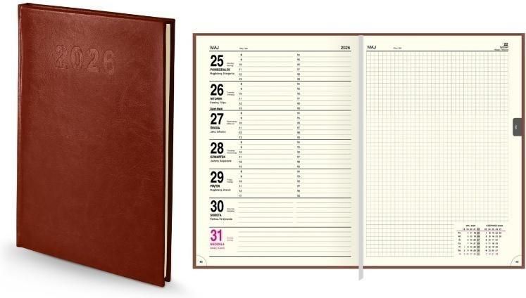 Terminarz A5 - Tygodniowy 2026 Producent: O-press Format: 14.0 x 20.7 x 22.0 cm Oprawa: Twarda EAN: 5904830716047 Cechy: Format A5 (140x207x22 mm) Ilość stron: 112 Dostępne kolory: czarny, granatowy, bordo, zielony, brąz Oprawa: twarda skóropodobna + gąbka Układ środka: dzień na stronie (tydzień na 1 stronie, druga strona cała na notatki) Wewnątrz tasiemka do oznaczania stron ułatwia odnajdywanie ważnych notatek lub ostatnio zapisanej strony Papier: 70 g/m2 w kolorze ecru Kalendarium: w języku polskim, angielskim, numeracja dni i tygodni, podwójne imieniny Część informacyjna: strony na notatki, telefony kierunkowe, skorowidz alfabetyczny, daty imienin i Świąt. Zaprezentuj swój profesjonalizm z naszym klasycznym, a zarazem nowoczesnym Terminarzem tygodniowym A5 na 2026 rok. Ten wyjątkowy kalendarz został zaprojektowany z myślą o tych, którzy cenią sobie pragmatyzm i minimalizm, jednocześnie nie rezygnując ze stylu. Jego prosta, ale elegancka estetyka idealnie komponuje się z każdym środowiskiem pracy i stylem życia. Kalendarz ma 112 strony i twardą, skóropodobną okładkę, która chroni wnętrze przed zniszczeniem, zapewniając jednocześnie elegancki wygląd. Układ środka jest niezwykle funkcjonalny - cały tydzień ma swoją stronę, a cała druga strona jest poświęcona na notatki, co ułatwia organizację i planowanie. Wewnątrz kalendarza znajduje się tasiemka do oznaczania stron, co pozwala na szybkie odnajdywanie ważnych notatek lub ostatnio zapisanej strony. Kalendarium w języku polskim, angielskim i ukraińskim zawiera numerację dni i tygodni oraz podwójne imieniny. Dodatkowe strony na notatki, telefony kierunkowe, skorowidz alfabetyczny oraz daty imienin i świąt zwiększają jego funkcjonalność.Przejrzysty układ i wystarczająca przestrzeń na notatki umożliwiają swobodne planowanie każdego dnia, co czyni nasz kalendarz idealnym narzędziem dla każdego, kto ceni sobie porządek i styl. Uwaga, wysyłamy jeden z dostępnych wzorów produktu.