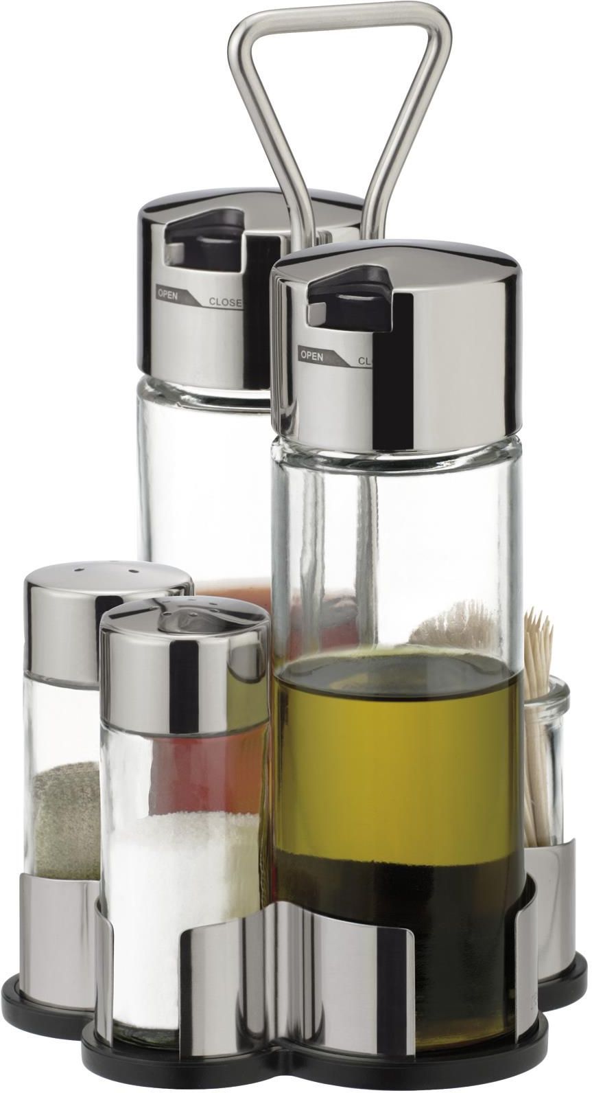 Komplet stołowy do przypraw, dla domu i placówek gastronomicznych Z wysoko jakościowej stali nierdzewnej, szkła i wytrzymałego tworzywa Wykończenie powierzchni metalowych – wysoki połysk Przekręcając pokrywkę można pojemniczki do oliwy i octu łatwo otworzyć lub zamknąć Linia produktów: CLUB Typ: …