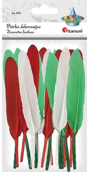 Piórka "Lotki", mix, Titanum, 24 szt Piękne piórka lotki w trzech kolorach, które udekorują Twój stroik, prezent czy przebranie świąteczne. Piękna opcja jesli poszukujesz czegoś wyjątkowego. Te długie piórka w trzech różnych kolorach urozmaicą Twoje prace plastyczne. marka: Titanum, ilość: 24 szt, …