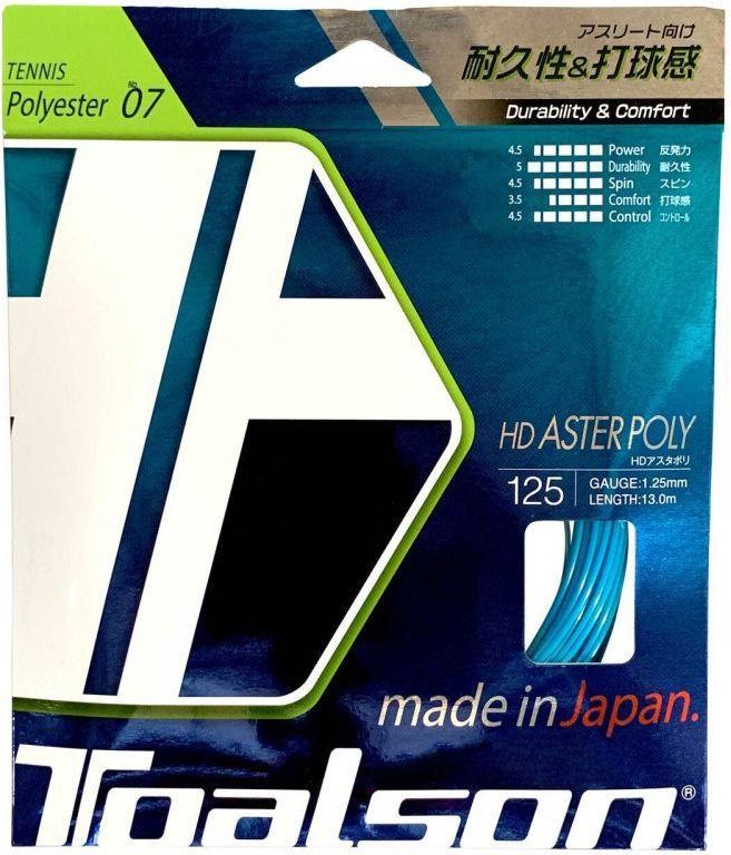 Naciąg tenisowy Toalson HD Aster Poly 1,25 Naciąg tenisowy od producenta Toalson wyposażony w rdzeń Asterista, który odpowiada za dostarczenie odpowiedniej dawki komfortowego czucia oraz optymalnej kontroli. Naciąg przez swoje właściwości pozwala dłuższy czas cieszyć się swoimi specyfikacjami - minimalny spadek naprężenia, HD Aster Poly jest bardzo wytrzymały.