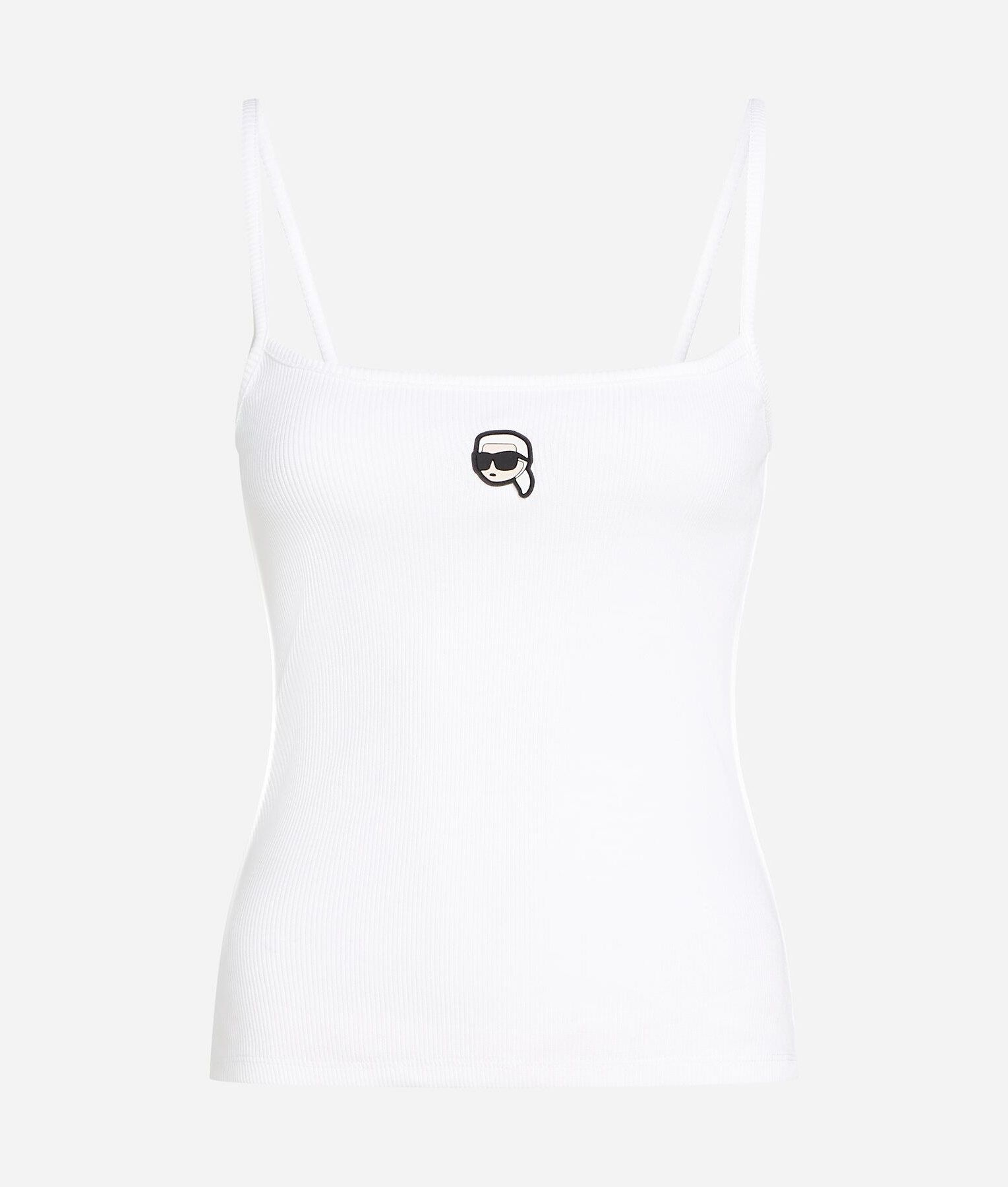 Biały damski top Ikon Patch Tank Top, marki Karl Lagerfeld.Na zdjęciu produkt w rozmiarze: S.Wymiary produktu w rozmiarze S: szerokość pod pachami: 29,5 cm, długość całkowita: 33 cm.