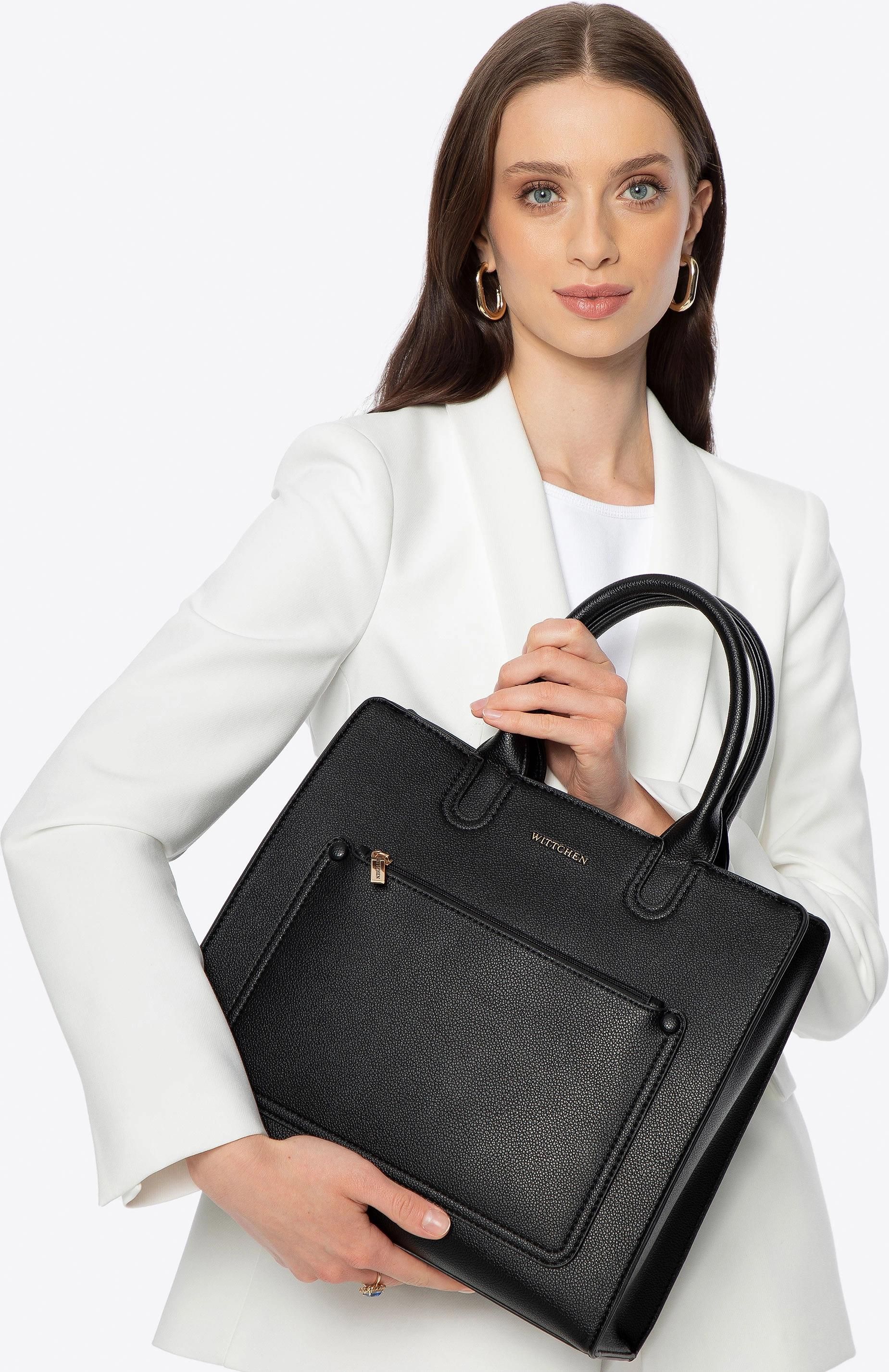 WITTCHEN – elegancja w nowoczesnym wydaniu WITTCHEN to polska marka premium z przeszło 30-letnim doświadczeniem, która od początku istnienia stawia na jakość, rzemiosło i wyjątkowy styl. Znana z ekskluzywnej galanterii skórzanej, dziś oferuje szeroką gamę produktów – od eleganckich torebek i butów, przez modną odzież, po funkcjonalne i stylowe walizki. Każdy detal w kolekcjach WITTCHEN to połączenie elegancji z nowoczesnością, klasyki z trendami, komfortu z luksusem. Wybierając WITTCHEN , wybierasz tradycję, jakość i niepowtarzalny charakter. Torba na laptopa 13” z imitacji skóry Kod produktu: 100-4Y-916-1 Elegancja w nowoczesnym wydaniu – torba na laptopa 13” Minimalistyczna, ale pełna klasy – ta torba na laptopa 13” została zaprojektowana z myślą o kobietach, które cenią estetykę równie wysoko jak funkcjonalność. Wykonana z ekoskóry , z wygodnymi rączkami , sprawdzi się zarówno w biurze, jak i podczas spotkań na mieście. Praktyczne zamknięcie na zamek gwarantuje bezpieczeństwo zawartości, a kieszenie z przodu i z tyłu pozwalają mieć pod ręką najpotrzebniejsze drobiazgi. Dla kogo? Jeśli szukasz torby , która pomieści Twój laptop ( do wymiarów 24 × 35 cm, 13” ) i jednocześnie będzie stylowym dodatkiem do codziennego looku – właśnie ją znalazłaś. Nasza rada : Dobierz do niej skórzany portfel w tym samym odcieniu lub stylowe etui na dokumenty – stworzysz elegancki i spójny zestaw. To doskonała alternatywa dla klasycznego plecaka na laptopa . Kluczowe cechy: Materiał : Wykonana ze skóry ekologicznej zapewnia elegancki wygląd i przyjemną w dotyku fakturę. Wyściełana kieszeń na laptopa : Bezpieczne miejsce na urządzenie o maks. wymiarach 22 × 26 cm, 13” – idealne, by chronić sprzęt przed wstrząsami i zarysowaniami. Zamykana na zamek : Dzięki temu masz pewność, że laptop i wszystkie cenne przedmioty są bezpiecznie schowane. Przemyślana organizacja: Dwie otwarte przegródki ułatwiają utrzymanie porządku w środku i pozwalają szybko sięgnąć po niezbędne akcesoria. Skład: 100% ekoskóra; podszewka : 100% poliester. Wygodne i funkcjonalne rozwiązania: Dwa sposoby noszenia : Komfortowe dwie rączki i odpinany , regulowany pasek pozwalają nosić torbę tak, jak Ci najwygodniej. Dodatkowe kieszenie z przodu i z tyłu na zamek : Idealne miejsce na telefon, klucze czy bilety – wszystko, czego potrzebujesz, znajdziesz bez szukania w głównej komorze. Cztery nóżki na spodzie : Torba nie styka się bezpośrednio z podłożem, co chroni ją przed zabrudzeniem i zarysowaniem.Postaw na praktyczną elegancję, która dotrzyma Ci kroku każdego dnia. Wybierz torbę, która łączy styl z funkcjonalnością. wysokość (cm): 30 szerokość (cm): 27 - 34 głębokość (cm): 6 - 16 sposób noszenia: do ręki, na ramię materiał: skóra ekologiczna pomieści format A4: nie waga (kg): 0,70 podszewka: 100% poliester wysokość całkowita (cm): 45,5 długość paska (cm): 112 - 124 długość rączek (cm): 40 dodatki: odpinany pasek elementy metalowe: w kolorze złotym orientacja: pozioma wielkość torebki: duża kolekcja: Young rodzaj torebki: torba na laptopa zapięcie: zamek sezon: na jesień, na lato, na wiosnę, na zimę okazja: do pracy styl: na zamek