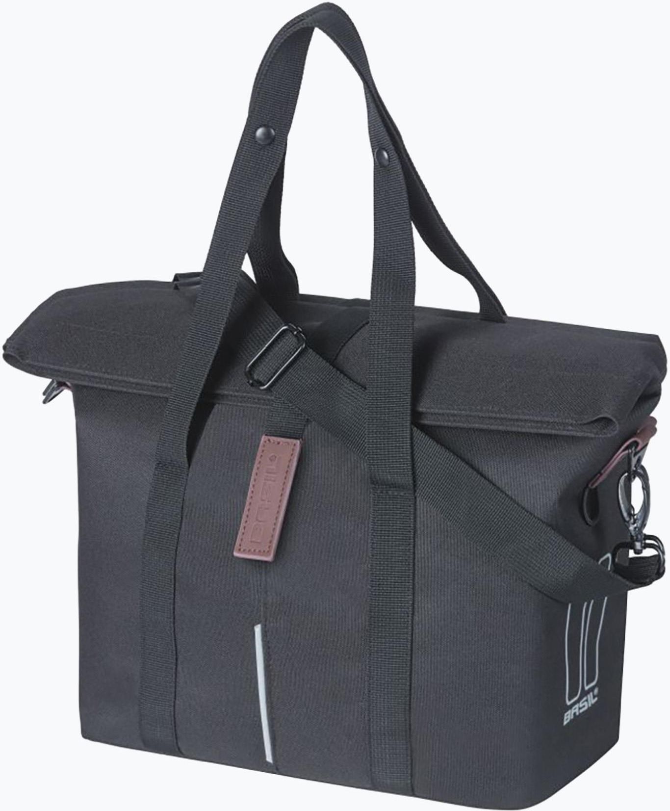 Basil City Handbag to uniwersalna torba na rower, którą możesz błyskawicznie zamontować na kierownicy lub rowerowym bagażniku. Klasyczny design, wytrzymałe materiały i możliwość wygodnego przenoszenia są jej największymi atutami. Przemyślany design Klasyczna czerń w połączeniu z tradycyjnym designem to połączenie, które nigdy nie wyjdzie z mody. Dzięki temu Basil City Handbag sprawdzi się w wielu sytuacjach — od tych bardziej służbowych po rekreacyjne. Pojemność 8 litrów pozwoli na zabranie ze sobą w trasę najpotrzebniejszych przedmiotów. Po zaparkowaniu roweru torbę możesz nosić na dwa sposoby — chwycić za uszy oraz przewiesić przez ramię z wykorzystaniem dodatkowego paska. Dodatkowym atutem są umieszczone na bryle torby niewielkie, ale skuteczne elementy odblaskowe. Jeśli chcesz jeszcze bardziej zwiększyć swoją widoczność na drodze po zmroku, możesz przypiąć lampkę do specjalnie zaprojektowanej pętli. Trzy sposoby montażu Basil City Handbag to torba, którą możesz zamontować tak, jak Ci wygodnie. Zyskujesz więc pewność, że wybierasz produkt naprawdę funkcjonalny. Możesz przypiąć torbę: na kierownicy za pomocą umieszczonej płytki adaptera Basil KlickFix (system nie jest częścią zestawu); na bagażniku, zawieszony po prawej lub lewej stronie koła za pomocą haczyków w systemie Basil Hook On; na bagażniku w jego centralnej części za pomocą systemu montażu MIK (musisz posiadać bagażnik MIK). Technologie+ Tu będzie się znajdował blok uniwersalny o ID: 145 Tytuł: Hook-OnTu będzie się znajdował blok uniwersalny o ID: 144 Tytuł: KlickFixTu będzie się znajdował blok uniwersalny o ID: 126 Tytuł: MIK
