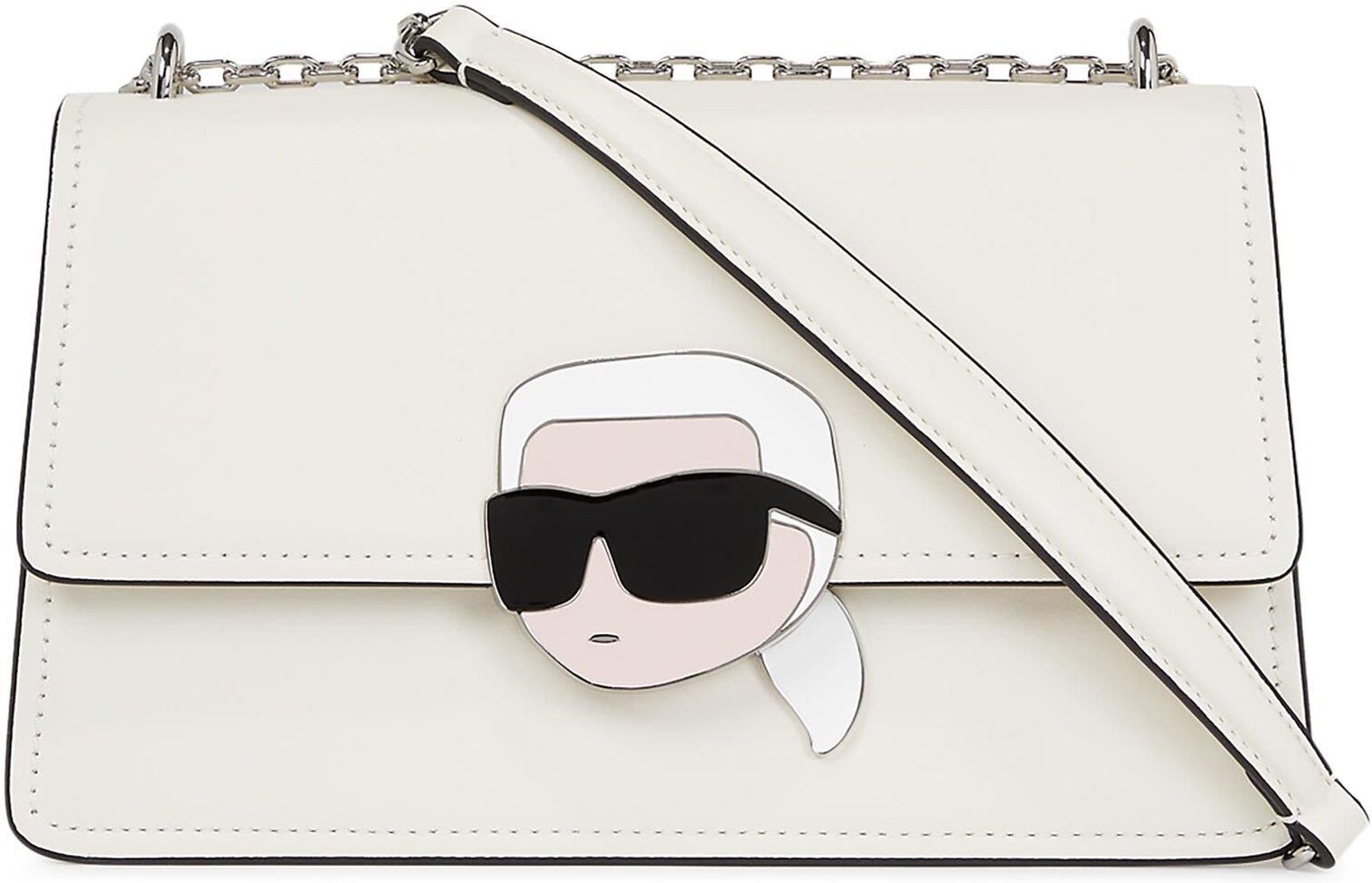 Dodaj nutkę zabawnej elegancji do swoich dziennych i wieczorowych stylizacji z tą uroczą, skórzaną torebką. Jej smukła sylwetka została zwieńczona unikalnym zapięciem Ikonik Karl i paskiem na ramię z połączenia skóry i łańcucha, dodającym rockowego charakteru.