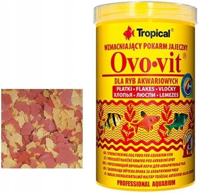 Tropical Ovo-Vit – wzmacniający pokarm dla ryb Ovo-Vit to specjalistyczny pokarm w formie płatków, który uzupełnia dietę ryb o cenne białko, nienasycone kwasy tłuszczowe i dobrze przyswajalną lecytynę z żółtek jaj. Dzięki wysokiej wartości odżywczej wspiera wzrost, dojrzewanie i przystępowanie do tarła. Jest szczególnie polecany dla tarlaków oraz młodych, rosnących ryb, a także w okresie rekonwalescencji, kiedy zwierzęta potrzebują łatwostrawnych i wysokoenergetycznych pokarmów bogatych w witaminy i mikroelementy. Dlaczego warto wybrać Tropical Ovo-Vit? Wzmacniający pokarm z dodatkiem żółtek jaj Wysoka zawartość białka, lecytyny, witamin i mikroelementów wspomagających wzrost i tarło Żółtka jaj jako źródło cennych nienasyconych kwasów tłuszczowych oraz luteiny Idealny w okresie leczenia, rekonwalescencji i aklimatyzacji ryb Optymalny poziom fosforu – zaspokaja potrzeby ryb i ogranicza zakwit glonów Skład Ryby i produkty rybne, zboża, jaja i produkty z jaj (min. 6%), roślinne ekstrakty białkowe, mięczaki i skorupiaki (w tym mączka z całych krewetek min. 0,5%), drożdże, produkty pochodzenia roślinnego (w tym ekstrakt z papryki czerwonej 5000 mg/kg), glony, oleje i tłuszcze, materiały paszowe pochodzenia mineralnego (w tym zeolit 1%). Składniki analityczne Białko surowe: 43,0% Oleje i tłuszcze surowe: 6,5% Włókno surowe: 2,0% Wilgotność: 6,0% Dodatki na kg Witaminy: A 23 000 j.m., D3 1 400 j.m., E 90 mg, C 335 mg Pierwiastki śladowe: Fe (E1) 27,0 mg, Zn (E6) 7,1 mg, Mn (E5) 5,3 mg, Cu (E4) 1,3 mg, I (E2) 0,16 mg, Se (E8) 0,15 mg, Mo (E7) 0,03 mg Lecytyna Barwniki Przeciwutleniacze