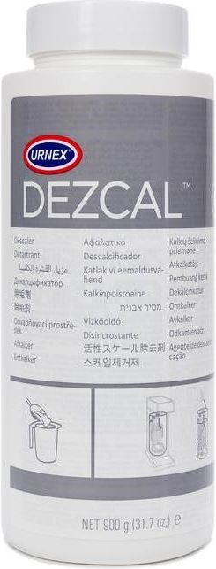 Urnex Dezcal - proszek do odkamieniania 900g Proszek odkamieniający, specjalnie opracowana formuła do skutecznego usuwania kamienia ze zbiorników wody oraz elementów maszyn do kawy. Usuwa osady mineralne, które zapychają i osłabiają sprzęt do zaparzania oraz umożliwia maszynom pracę na optymalnym poziomie. Aktywowany środek do usuwania kamienia Dezcal™ może być również używany do konserwacji kranów, głowic natryskowych i systemów mleka. Jest nietoksyczny, biodegradowalny i bezpieczny odkamieniacz w proszku. Dezcal Decaling Powder jest bezzapachowy i dokładnie się spłukuje, w przeciwieństwie do octu, który może być trudny do spłukania. Produkt należy stosować: 28g g proszku na 500 ml wody. Mieszać do rozpuszczenia Trzymać roztwór w naczyniu do 30 minut Opakowanie: proszek 900g Producent: Urnex