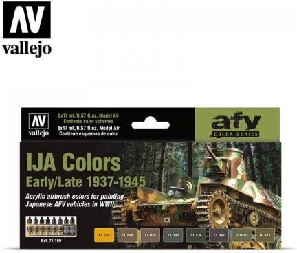 Zestaw zawiera kolory do malowania kamuflaży Cesarskiej Armii Japońskiej (IJA) i zawiera wzór dla wczesnych kolorów kamuflażu HA-Go w Chinach i Pacyfiku 1937-1942 oraz kolory CHI-HA Late Camouflage wprowadzone w 1942 roku. Zawartość: 8 x 17 ml./0.57 fl.oz. Model Air 70.611 Earth Green (Early) 71.136 IJA Earth Brown 71.134 IJA Midouri Green 71.035 Camouflage Pale Brown 71.135 IJA Chrome Yellow 70.610 Parched Grass (Late) 71.093 NATO Green 71.042 Dark Brown RLM61