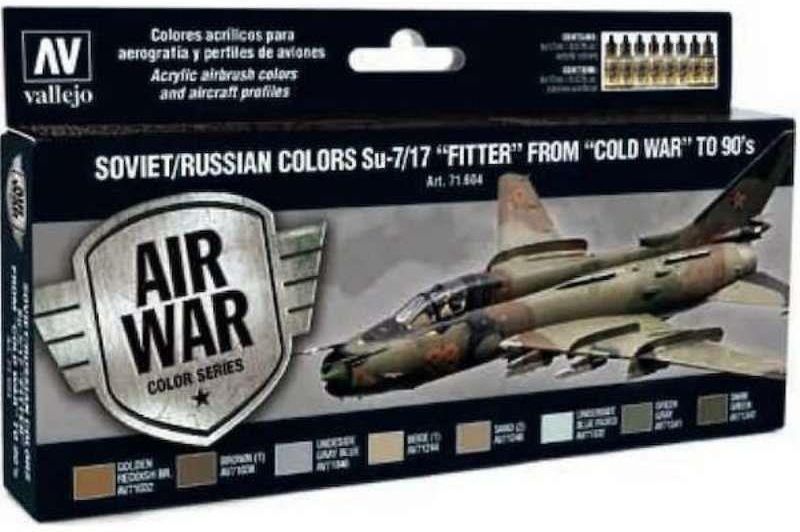 VALLEJO 71604 Soviet/Russian colors Su-7/17 “Fitter” from “Cold War” to 90’s [PAINT SET] VALLEJO Numer katalogowy/catalogue number: 71604 Pojemność/Capacity: 8 x 17ml (8 farb) EAN: 8429551716048 Zestaw z kolorami Model Air opracowanymi do malowania różnych modeli Sukhoi Su-7 „Monter” i ulepszonego …