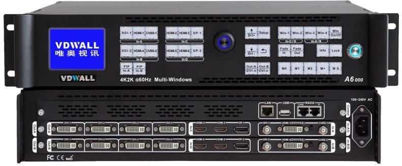 Procesor wideo posiadający: 2x karta wejściowa 4K (4x HDMI 2.0, 2x DP), 2x karta wejściowa 2K (2x HDMI 1.3, 2x SDI, 2x CVBS), 1x karta wyjściowa (4x DVI), efekty: 4 mozaiki, 4x PIP, wyświetlanie 6 warstw