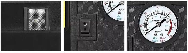 Kompresor samochodowy to przenośne urządzenie do pompowania wszelkiego rodzaju opon samochodowych, motocyklowych, rowerowych, piłek, materacy i wiele innych. Umożliwiają to dołączone do zestawu adaptery. Zasilany z gniazda zapalniczki. Doskonale nadaje się do pompowania wszelkiego rodzaju Kompresor samochodowy to przenośne urządzenie do pompowania wszelkiego rodzaju opon samochodowych, motocyklowych, rowerowych, piłek, materacy i wiele innych. Umożliwiają to dołączone do zestawu adaptery. Zasilany z gniazda zapalniczki. Doskonale nadaje się do pompowania wszelkiego rodzaju przedmiotów tj. koła samochodowe, rowerowe, piłki materace, itp. Kompresor posiada również zintegrowaną lampkę LED, która umożliwia wygodne doświetlanie koła. SPECYFIKACJA TECHNICZNA: ✅ Kod produktu: 24019 ✅ Ciśnienie tłoczenia: 150PSI/10bar ✅ Przepływ powietrza: 27 L/Min ✅ Idealny do pompowania kół samochodowych ✅ Wąż powietrzny o długości ok. 49cm z zaworem zamykającym ✅ Kabel zasilający o długości ok. 300cm ✅ Końcówki do pompowania artykułów sportowych - 3 szt ✅ Zapasowy bezpiecznik ✅ Zasilanie: samochodowe DC 12V ✅ Wskaźnik ciśnienia (manometr) ✅ Wbudowana lampka LED ✅ Posiada włącznik On/Off ✅ Wymiary: 19,5cm x 15,5cm x 7,5cm ✅ Produkt posiada certyfikat CE ZESTAW ZAWIERA: ☑️ Fabrycznie nowy kompresor samochodowy 12V ☑️ Zestaw końcówek do pompowania kół, piłek, itp. ☑️ Bezpiecznik ☑️ Oryginalne opakowanie