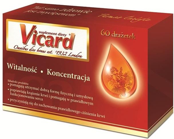 Postać leku: Drażetki--------------------Dawka:--------------------Opakowanie: 30 drażetek--------------------Skład: Sacharoza, celuloza mikrokrystaliczna, wyciąg z głogu, talk, wyciąg z żeń-szenia, fosforan diwapniowy, kwas L-askorbinowy, dwutlenek krzemu, dwutlenek tytanu, amid kwasu nikotynowego, wyciąg z wina, guma arabska, stearynian magnezu, D-pantotenian wapnia, octan DL-alfa-tokoferylu, chlorowodorek pirydoksyny, ryboflawina, monoazotan tiaminy, czerwień koszenilowa, kwas pteroilomonoglutaminowy, D-biotyna, cyjanokobalamina, wosk Carnauba--------------------Działanie: Uzupełnia dietę w cenne dla zdrowia substancje i witaminy. Wspomaga pracę serca i układ krążeniowy. Działa tonizująco na układ nerwowy. Dodaje sił. Opóźnia procesy starzenia się.--------------------Wskazania: Dla ludzi dorosłych szczególnie w wieku powyżej 50 lat, jako preparat uzupełniający dietę w cenne dla zdrowia naturalne flawonoidy, kwercetynę, rezerwatrol i giensenozyd, pochodzące z wyciągów z głogu, żeń-szenia oraz czerwonego wina oraz w witaminy. --------------------Przeciwwskazania: Uczulenie na którykolwiek ze składników produktu.--------------------Ostrzeżenia: W okresie ciąży i karmienia decyzję o stosowaniu powinno się konsultować z lekarzem.--------------------Dawkowanie: 1 drażetka dwa razy dziennie.