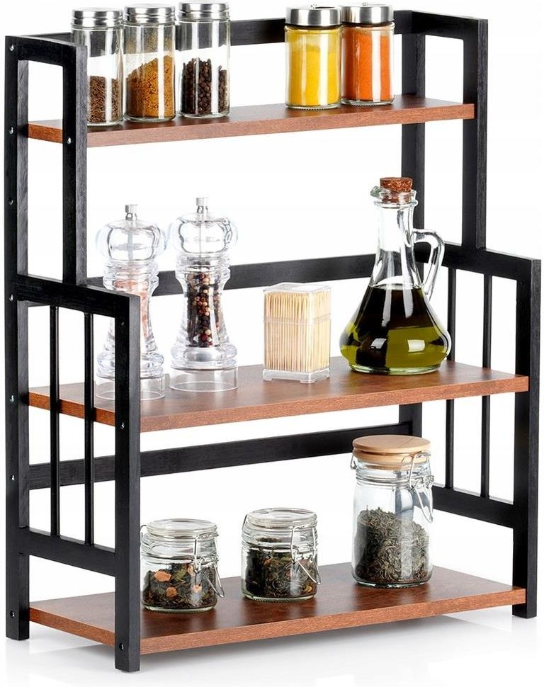 Praktyczna półka kuchenna - Półka kuchenna pozwoli na lepszą organizację przestrzeni w kuchni. Doskonale sprawdzi się do przechowywania przypraw, kubków, pojemników czy misek. Półka ma wymiary zewnętrzne: 41,5 x 18,5 x 50 cm. Wykonana z drewna - Wykonana w całości z najwyższej jakości drewna. Półki są w kolorze brązowym, a boki w kolorze czarnym. Półka jest wytrzymała i stabilna. Półka wyposażona jest w filcowe podkładki na nóżkach, które zapobiegają rysowaniu powierzchni. Trzy poziomy przechowywania - Posiada trzy poziomy przechowywania, które umożliwiają wygodne rozmieszczenie słoiczków, przypraw i innych kuchennych drobiazgów. Pozwala uporządkować akcesoria, jednocześnie oszczędzając miejsce na blacie. Uniwersalne zastosowanie - Organizer doskonale sprawdzi się ustawiony na blacie kuchennym, zapewniając łatwy dostęp do przypraw i jednocześnie pomagając utrzymać porządek. Idealna do kuchni, spiżarni, szafek, ale także do biura czy łazienki. Doskonałe rozwiązanie do lepszego zagospodarowania miejsca w każdej przestrzeni. Modny design - Połączenie brązowego drewna i czarnej konstrukcji tworzy nowoczesny design, który pasuje do każdego wnętrza. Praktyczna półka kuchenna, która pozwoli na przechowywanie przypraw i akcesoriów kuchennych na trzech poziomach. Idealna do uporządkowania przestrzeni w kuchni. Można ją użytkować np. na blacie kuchennym, zyskując dodatkowe miejsce. Półka jest niezwykle uniwersalna i sprawdzi się w różnych aranżacjach wnętrz. Oryginalny produkt marki Vilde. Wyprodukowano zgodnie z europejskimi standardami.