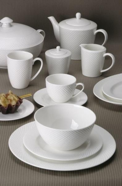 Serwis obiadowy dla 12 osób Villa Italia Bari Kolekcję Bari wykonano z porcelany typu bone china, niezwykle cienkiej, delikatnej, w mlecznym odcieniu bieli. Klasyczny fason zastawy wzbogacony został tłoczeniami - geometrycznym reliefem w formie kosteczki - które dodają naczyniom elegancji i …