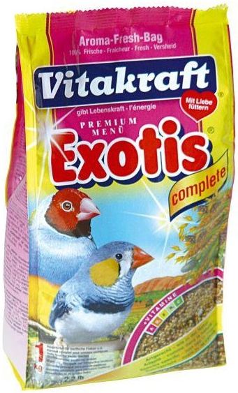 VITAKRAFT EXOTIS - opakowanie 1kg Exotis - codzienna karma dla egzotycznych ptaków ozdobnych. Mieszanina ziaren wzorowana na naturze. Całkowite egzotyczne Premium Menu - zdrowa mieszanka z wybranych, dojrzałych na słońcu nasion bogatych w białko. Wzbogacona witaminami A, D3, E, B2, C, składniki mineralne, zwierzęce i roślinne tłuszcze. Jest to wartościowa i podstawowa karma charakterystyczna dla gatunku. Wzmacnia odporność i chroni zdrowie skrzydlatego pupila. SKŁAD zboża, minerały, oleje i tłuszcze, produkty piekarnicze, miód, drożdże, nasiona, pochodne sadzonek warzyw. 12.6% proteiny, 5.5% tłuszcz, 9% błonnik, 3.8% popiół, 10.7% wilgotność. Dodatkowe witaminy: Wit. A 5936 U.I., Wit D3 566 U.I., Wit. E 17 mg, Wit. B2 3.45mg, Wit. C 56mg, miedź 0.39mg, jod 10mg. zawiera substancje dodatkowe EG.