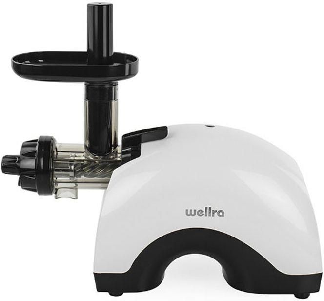 Nowoczesna wyciskarka dwuślimakowa pozioma Wellra. Po wielu latach użytkowania tradycyjnych wyciskarek dwuślimakowych, pojawił się nowoczesny model, który zachował tradycyjne rozwiązania , wprowadzając do konstrukcji wyciskarki współczesne, nowoczesne rozwiązania . Dzięki takiemu połączeniu mamy zachowaną najwyższą wydajność wyciskania, pyszny, jednolity i odżywczy sok, zdecydowanie łatwiejsze czyszczenie i znacznie mniejsze rozmiary. Prosty, nieskomplikowany wygląd wyciskarki pasuje pod kuchnie tradycyjne jak i wykonane w nowoczesnym stylu. Wyciskarka Wellra to wyciskarka dwuślimakowa, dzięki czemu doskonale sprawdza się przy wyciskaniu naci, warzyw , ale również owoców . Wyciskarka Wellra posiada również kilkustopniowy regulator wypływu pulpy, który znajduje się tylko w najlepszych wyciskarkach poziomych, a dzięki niemu wyciskanie jest jeszcze dokładniejsze. W zestawie do wyciskarki - w przeciwieństwie do innych podobnych, bliźniaczych - znajdują się aż trzy nakładki - do soków, do soków gęstych i wkładka homogenizacyjna. Znana, dobra konstrukcja wałków, dokonuje maksymalnego wyciśnięcia soku niezależnie od typu produktu. W pierwszej fazie następuje rozdrabnianie i miażdzenie, a w ostatnim momencie, maksymalne wyciśnięcie. Wałki są też napędzane przez mocny silnik o mocy 3 KM. Nawiązując do czyszczenia, teraz wystarczą trzy proste ruchy, aby zdemontować moduł wyciskający, po czym elementy wyciskające przepłukujemy pod strumieniem wody. W skład wyciskarki wchodzi: - trzy rodzaje sit - pojemnik na sok i na pulpę - modyfikator wypływu pulpy - popychacze, szczoteczka, klucz do łatwego odkręcania i zakecania - gwarancja oraz instrukajca w języku polskim oraz angielskim